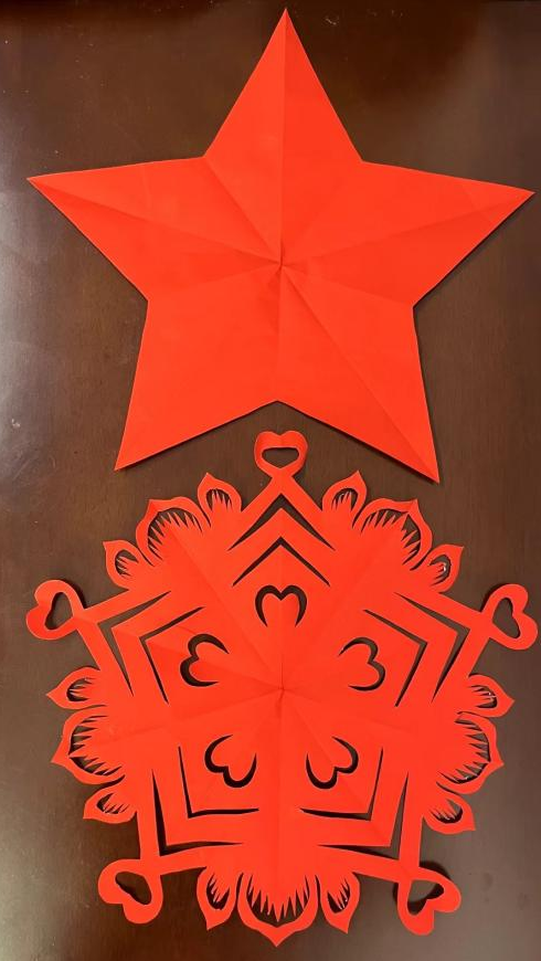 大家围坐在一起,目光紧紧地盯着手中的红纸和剪刀,认真聆听着丛敏老师的讲解。在老师的指导和帮助下,大家互相交流、相互学习,细细摸索对照,在实践过程中充分体验“折、画、剪、展、裱”的全过程,并以民俗民风为主题,创作了“石榴”“福禄寿禧”“蝶恋花”等题材的剪纸。随着时间的推移,一幅幅精美的剪纸作品在大家的手中逐渐成形,欢声笑语回荡在整个活动现场。大家还穿上了亲手制作的剪纸云肩、披风等服饰,对非遗文化有了更具象化的认识和理解。
