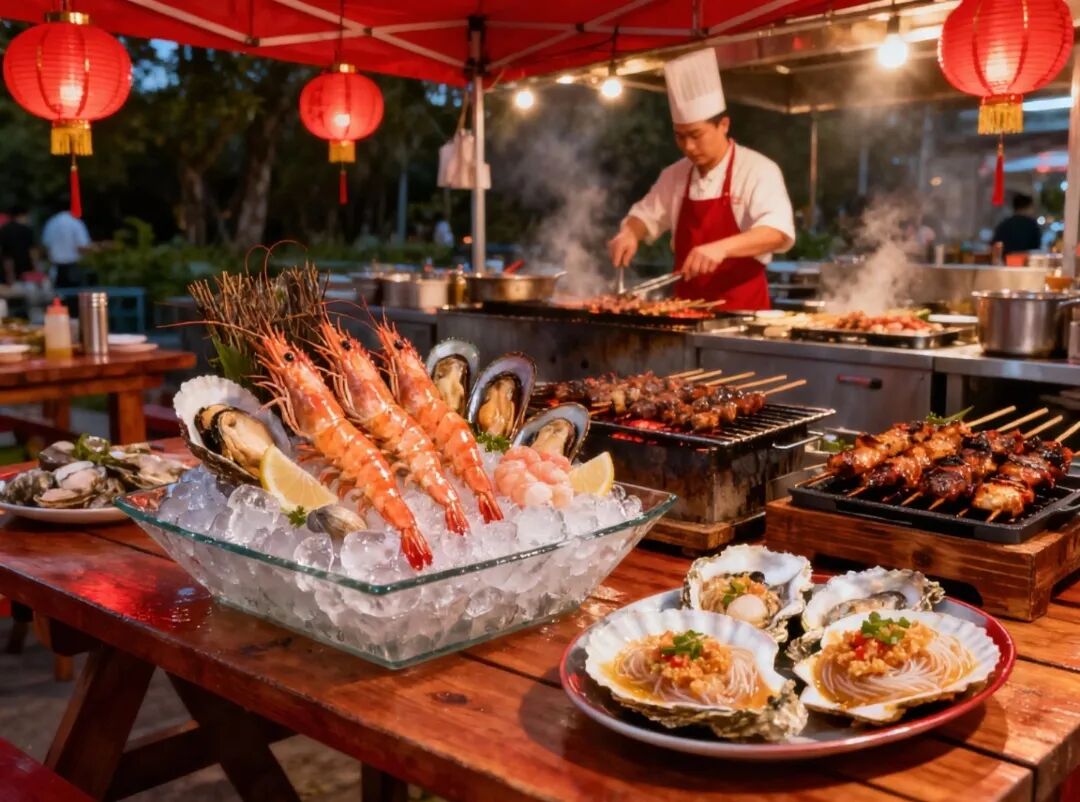 陆海相逢,双味争鲜!这不仅是一场辣子鸡的盛宴,更是一次风味的奇幻旅行。您可以在枣庄本地,同时品尝到“辣子鸡的鲜辣”与“小海鲜的鲜香”。现场开设海鲜档口,即时烹饪、新鲜直达的生蚝、大虾、扇贝等各式小海鲜,原汁原味,让您仿佛置身海滨。