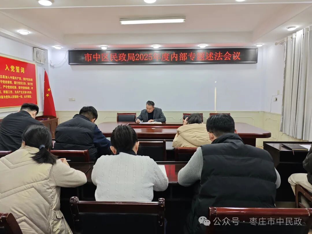 12月11日下午,区民政局在二楼会议室召开2025年度内部专题述法会议。区民政局党组副书记、区民政事务综合服务中心主任王明国主持会议并讲话。