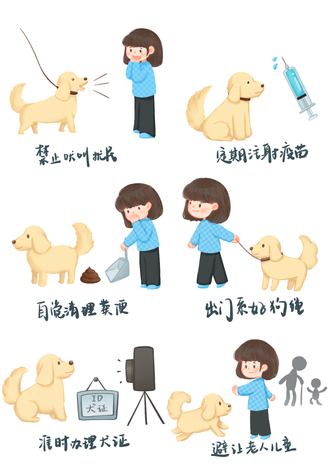行为规范:主动避让老人、孕妇、儿童,避免在禁遛区(学校、医院等)遛犬,深夜控制犬吠避免扰民。