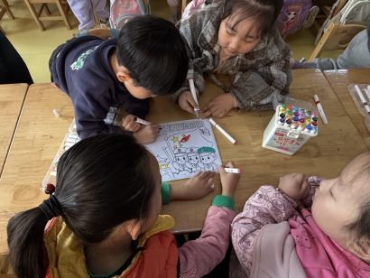观影结束后,孩子们拿起画笔认真为戍边的军人叔叔们制作贺卡。小朋友们发挥想象,用彩笔、贴纸等材料,将心中纯真的敬意与真挚的新春祝福融入一幅幅充满童趣的画作中。孩子们有的画了五星红旗,旁边写着“叔叔们,你们是最棒的”;有的用棉花贴出雪山的形状,表达对边关环境的理解;还有的画了自己和边防叔叔手拉手的场景,寓意着心连心。中班的小雨在贺卡上画了两个拥抱的小朋友,她说:“我想给叔叔一个大大的拥抱。”