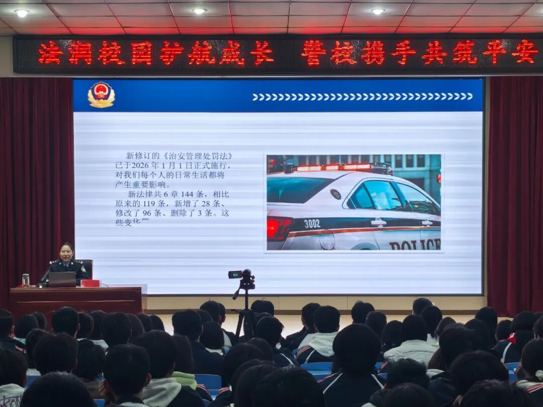 活动中,交警大队民警围绕电动车安全骑行、一盔一带、乘车安全等交通知识,通过视频案例重点讲解了步行、骑行、乘车安全要点,引导学生树立文明交通意识;反诈民警围绕电信网络诈骗的常见类型及防范措施、如何预防“两卡”犯罪开展讲解,让学生牢记“不轻信、不透露、不转账”的反诈原则;法制民警围绕新修订的《中华人民共和国治安管理处罚法》,讲解了与未成年人息息相关的条款和校园欺凌的相关知识,明确法律后果,引导学生遵纪守法、学会自我保护。
