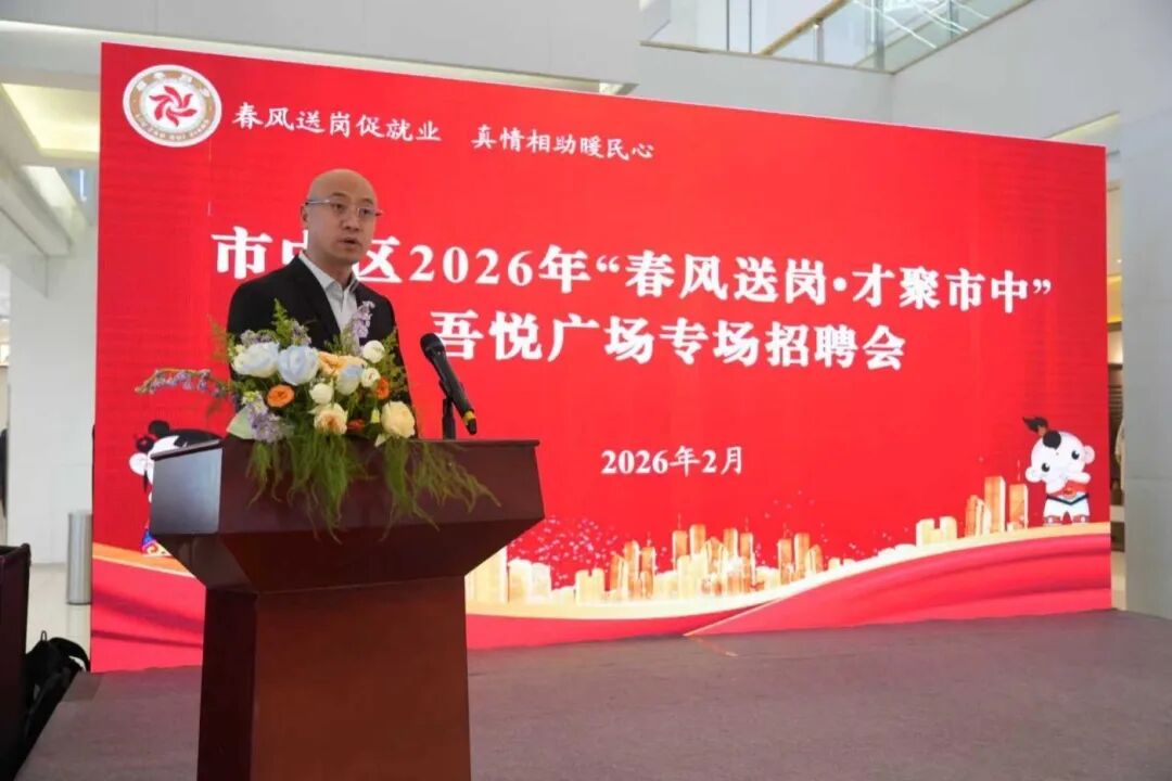 春风送暖,万象更新。2月8日上午,2026年市中区"春风送岗·才聚市中"吾悦广场专场招聘会在枣庄吾悦广场成功举办。本次活动由区人力资源和社会保障局、中心街街道办事处联合主办,区总工会、团区委、区妇联、区退役军人事务局、区融媒体中心、邮储银行枣庄市中支行共同承办,枣庄市人才发展集团、枣庄吾悦广场协办。活动紧扣"春风行动"暨"就业援助季"主题,围绕"服务企业年"要求,以精准对接、丰富岗位、广泛参与为特色,为人才与企业搭建高效沟通桥梁。