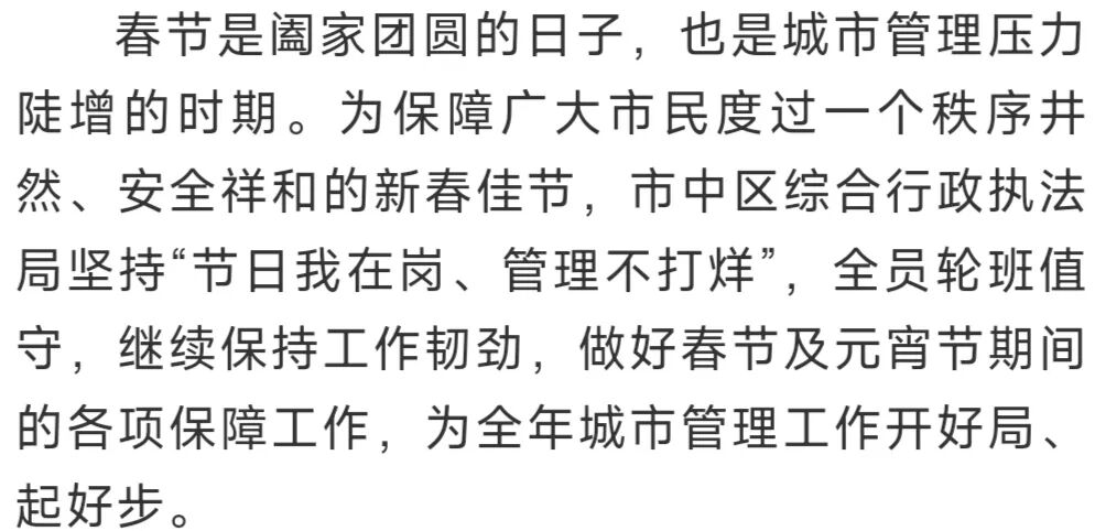 新的一年,市中城管将以更务实的作风,更细致的举措,扎实做好城市管理各项工作,始终做好城市的守护者,群众的贴心人。