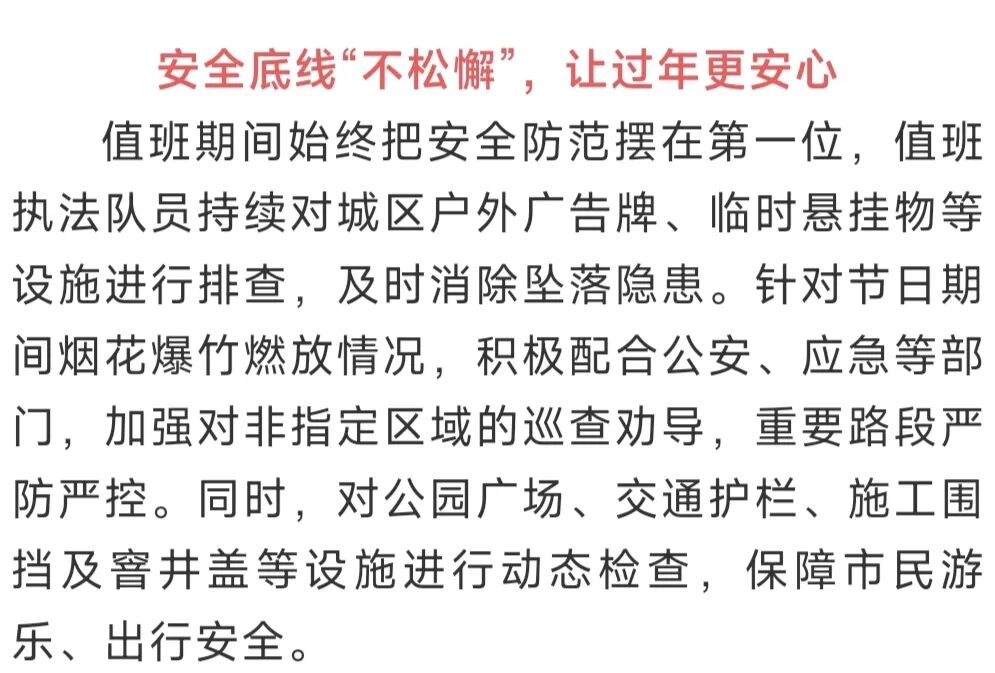 市中城管人,以“不打烊”的坚守与“不停歇”的保障,将平安写在城市街巷,让整洁留在市民身边,把有序送在群众眼前。