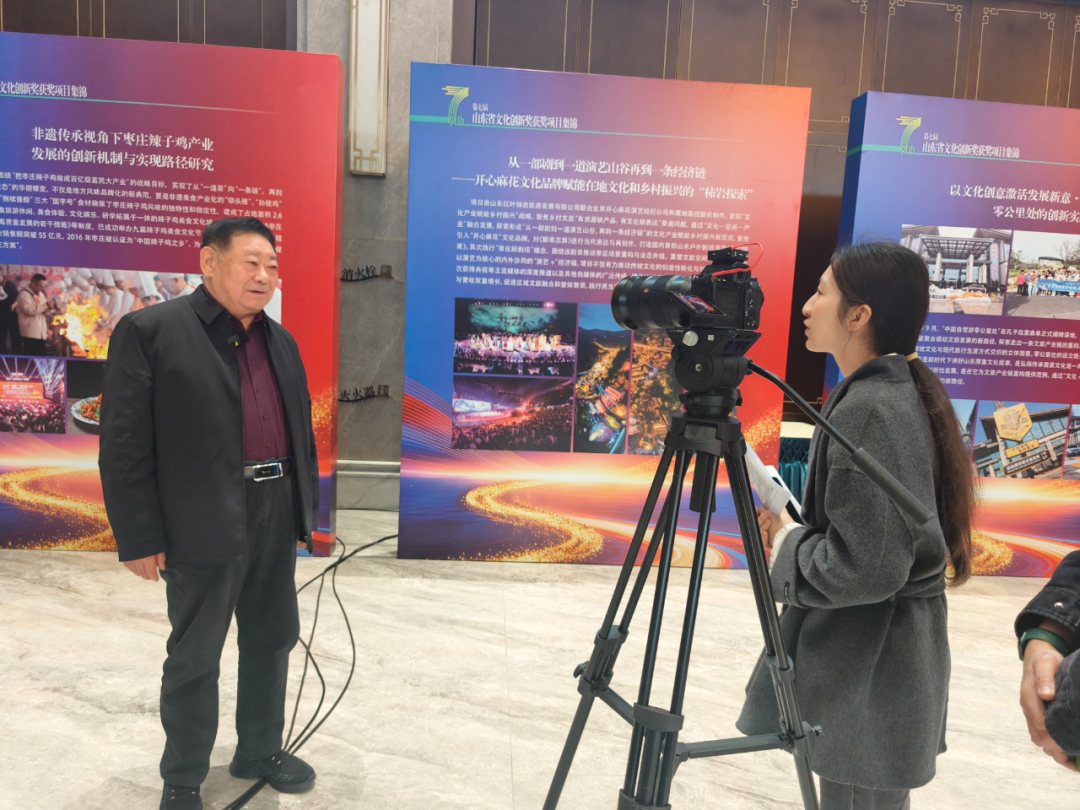 市中区文化馆徐秋然馆长作为代表上台领奖,枣庄辣子鸡传统烹饪技艺省级代表性传承人王新权老师现场接受省电视台采访,从技艺标准化与产业化融合、全产业链带动就业增收、非遗活态传承创新路径三个方面,分享了非遗传承与产业发展的创新实践。