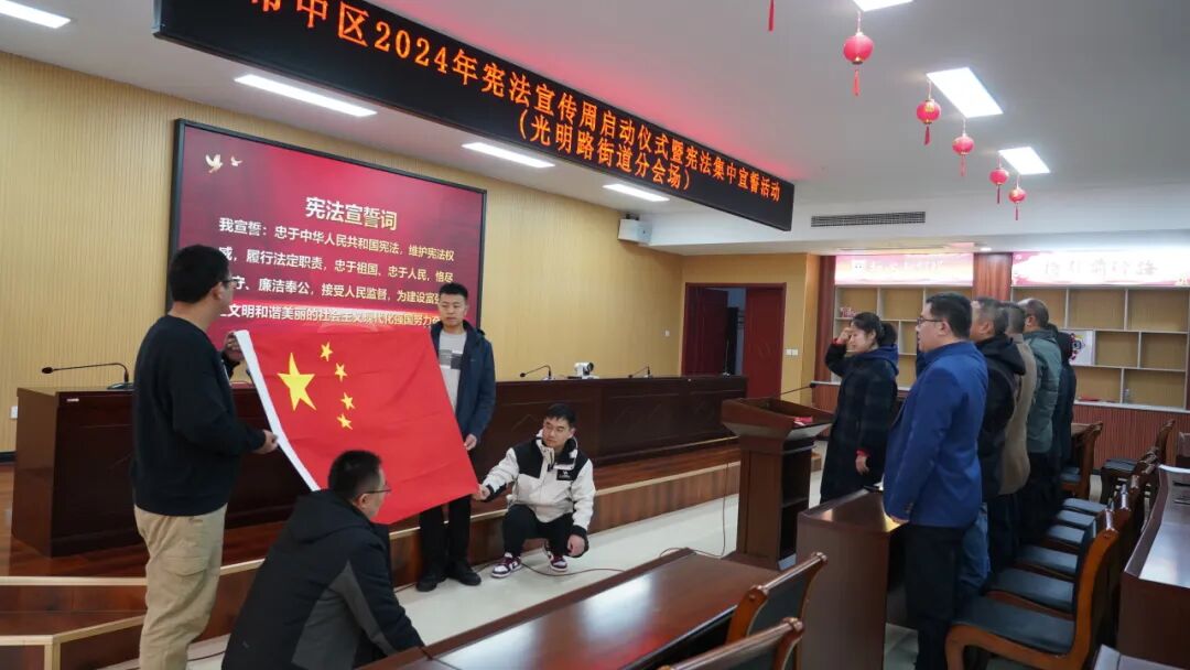 12月4日,光明路街道举行宪法宣誓仪式。向宪法宣誓,不仅是一个仪式,更是一次承诺。“我宣誓:忠于《中华人民共和国宪法》,维护宪法权威,履行法定职责……”宣誓仪式上,街道全体机关干部、工作人员面向国旗肃立,宣誓铿锵有力,承诺掷地有声,表达了全体机关干部、工作人员对宪法的信仰、敬畏和尊崇,以及维护宪法权威、捍卫宪法尊严的决心。