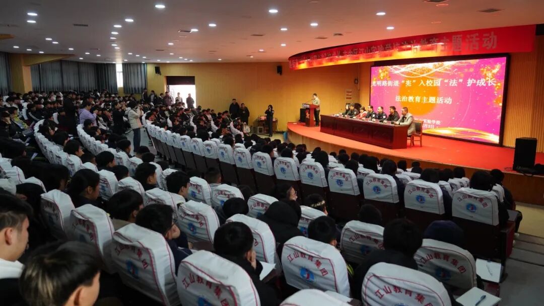 由街道平安法治办牵头,以“宪”入校园 “法”护成长法治教育主题活动于12月3日在江山实验中学举行,区法学会、区公安分局反诈中心、区特警大队、光明路街道司法所、垎塔埠派出所、光明路街道教育学区以及山东全和律师事务所等多家单位积极参与,共同为青少年送上了一堂生动的宪法教育课。