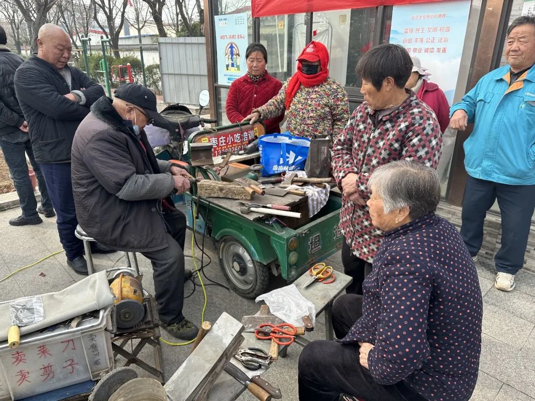 “起刀、磨剪子”看似是一件小事,但放在村民生活中是必不可少的常事。一大早,来修理菜刀、剪刀、锄头等劳动工具的村民就在广场排队等候,伴随着刀具与机器的摩擦声,一上午村民和志愿者师傅有说有笑,现场洋溢着浓厚的喜庆氛围。