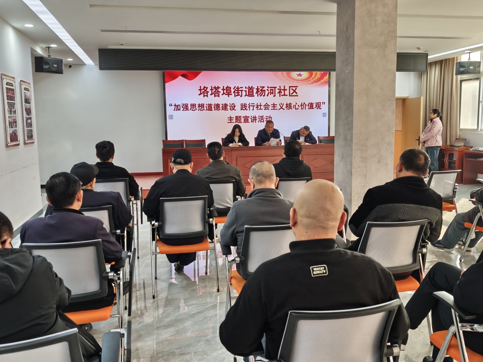 为响应国家关于培育和践行社会主义核心价值观的工作要求,将思想道德建设融入基层社区治理,11月11日,垎塔埠街道杨河社区在会议室开展“加强思想道德建设 践行社会主义核心价值观”主题宣讲活动。基层党组织书记宣讲团成员、社区书记杨尚喜宣讲,此次活动受众人数24人。