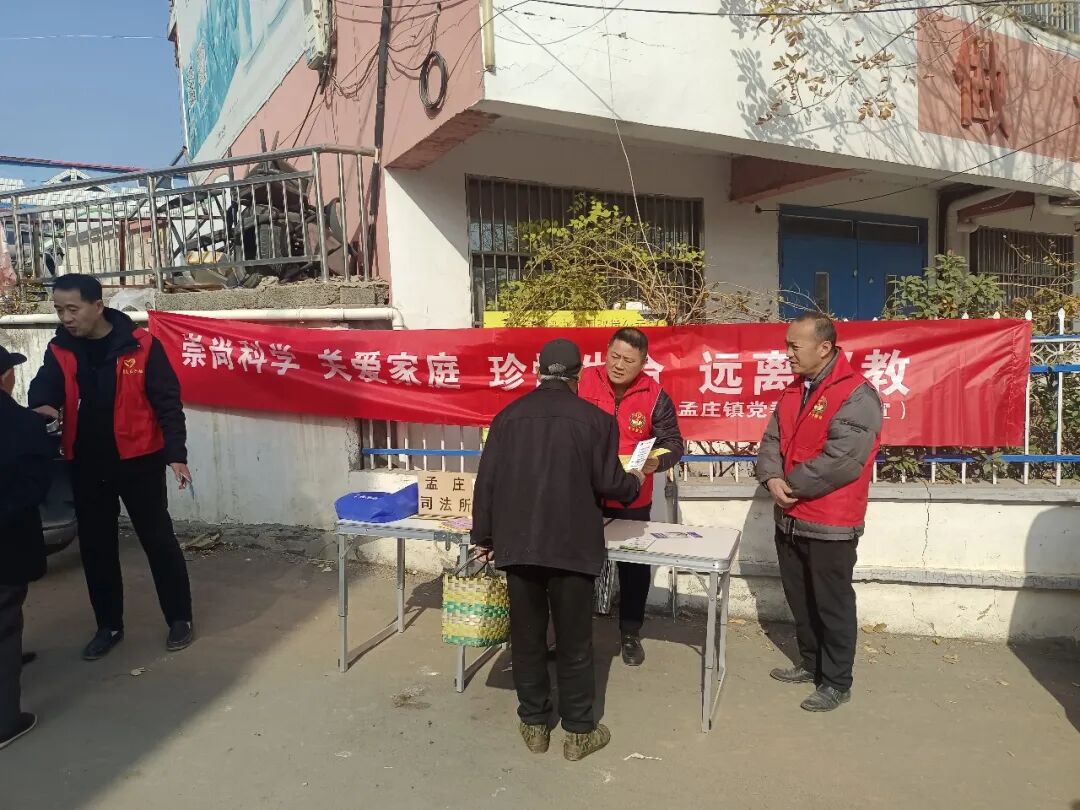 为进一步提升基层群众的反邪教意识,筑牢反邪教思想防线,近日,孟庄司法所联合镇相关职能部门在孟庄镇辖区崖头村积极开展了以“崇尚科学,关爱家庭,珍惜生命,远离邪教”为主题的“法治进乡村”反邪教普法宣传活动。