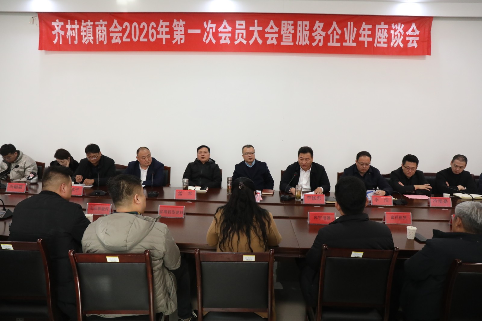 1月16日,齐村镇商会2026年第一次会员大会暨“服务企业年”座谈会在镇商会会议室举行。区政协副主席、工商联主席张兵到会指导,镇党委书记李修忠主持会议,镇党委副书记、镇长李浩,商会会长周新文及全镇商会会员企业主要负责人参加会议。