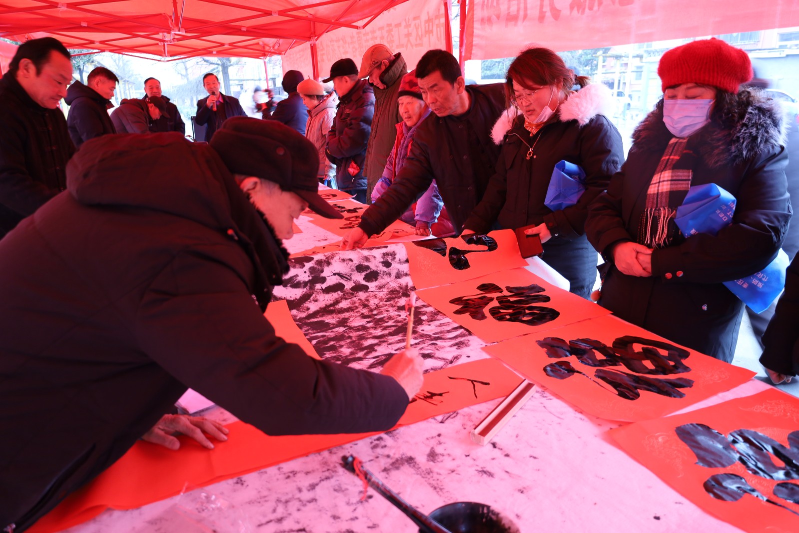 活动现场暖意融融、热闹非凡。华艺家书法协会的艺术家们现场挥毫泼墨,“天增岁月人增寿,春满乾坤福满门”“一帆风顺吉星到,万事如意福临门”……一副副苍劲有力的春联和“福”字在红纸上跃然而出。