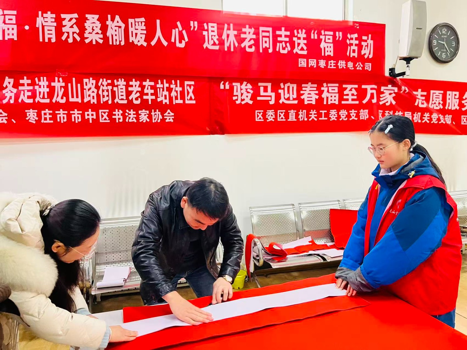 新春的脚步越来越近,年味在街头巷尾悄然蔓延。为了传承中华优秀传统文化,给社区居民送上最真挚的新春祝福,同时拉近社区与居民之间的距离,老车站社区联合双报道单位区委区直机关工委党支部、区科技局机关党支部以及区书法家协会在新华南区红色驿站开展“骏马迎春福至万家”志愿服务暨“双报到”活动,让浓浓的年味与温暖住进每一位居民心里!