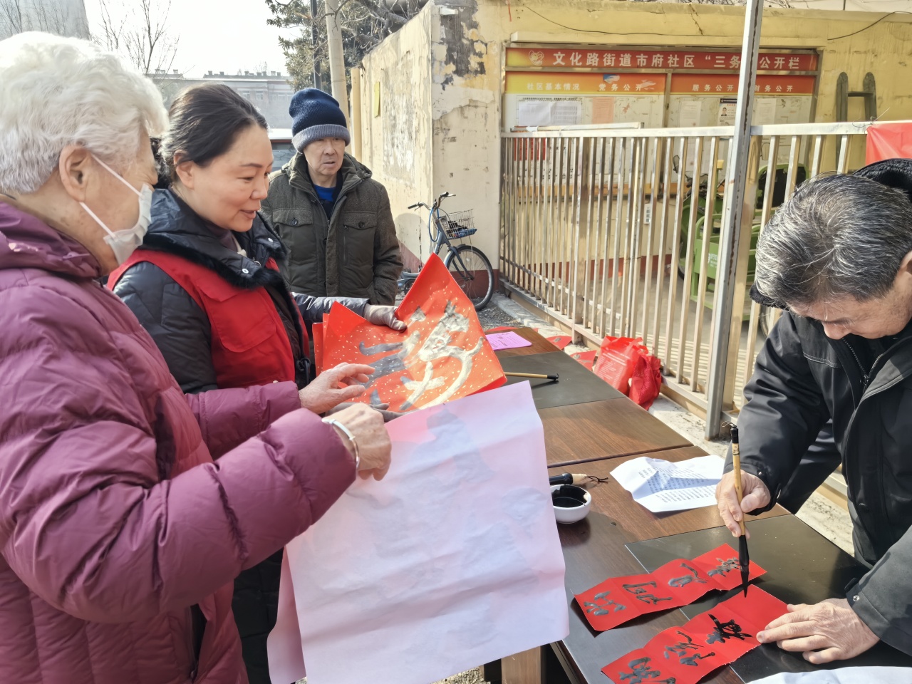 活动现场,墨香四溢。农商银行振兴支行邀请的书法家和实验幼儿园的老师们挥毫泼墨,笔走龙蛇,一个个饱满圆润的“福”字跃然纸上,一副副寓意吉祥的春联引人驻足。有的“福”字端庄大气,有的则充满童趣创意,展现出不同风格的艺术魅力。活动最后,这些饱含心意的福字和春联全部送到了社区居民手中。居民们纷纷表示,这样的活动既接地气又暖人心,让大家感受到了浓浓的年味和社区大家庭的温暖。