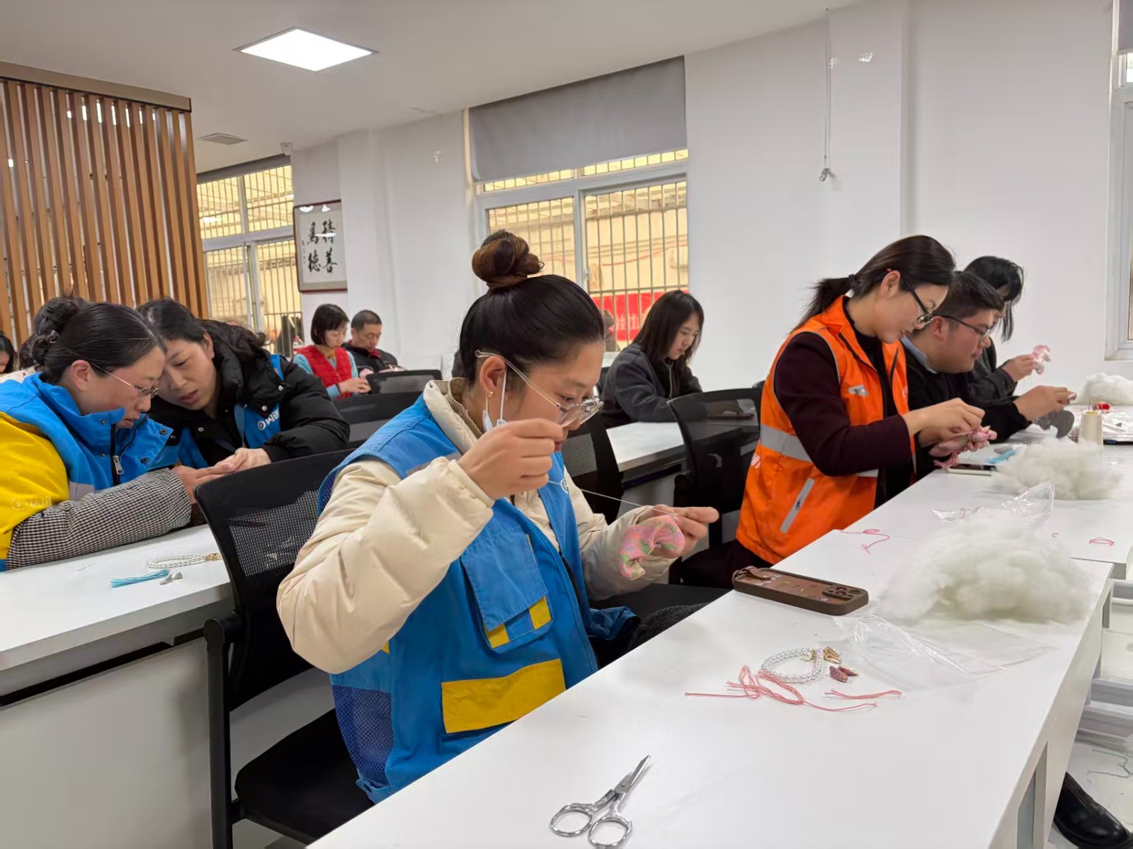 活动中,在巾帼志愿者王欣老师的耐心指导下,女外卖员、快递员们暂时放下手中的订单与包裹,围坐在一起,拿起剪刀、胶水与彩绳,亲手制作属于自己的节日礼物。有的专注编织宋锦图案,有的细致粘贴挂件装饰,现场不时传来轻声交流与实践操作的声音,气氛既热闹又温馨。尽管平时习惯了风里来雨里去的工作节奏,但在这一刻,她们仿佛回到慢下来的时光,用双手创造美,用心灵感受爱。