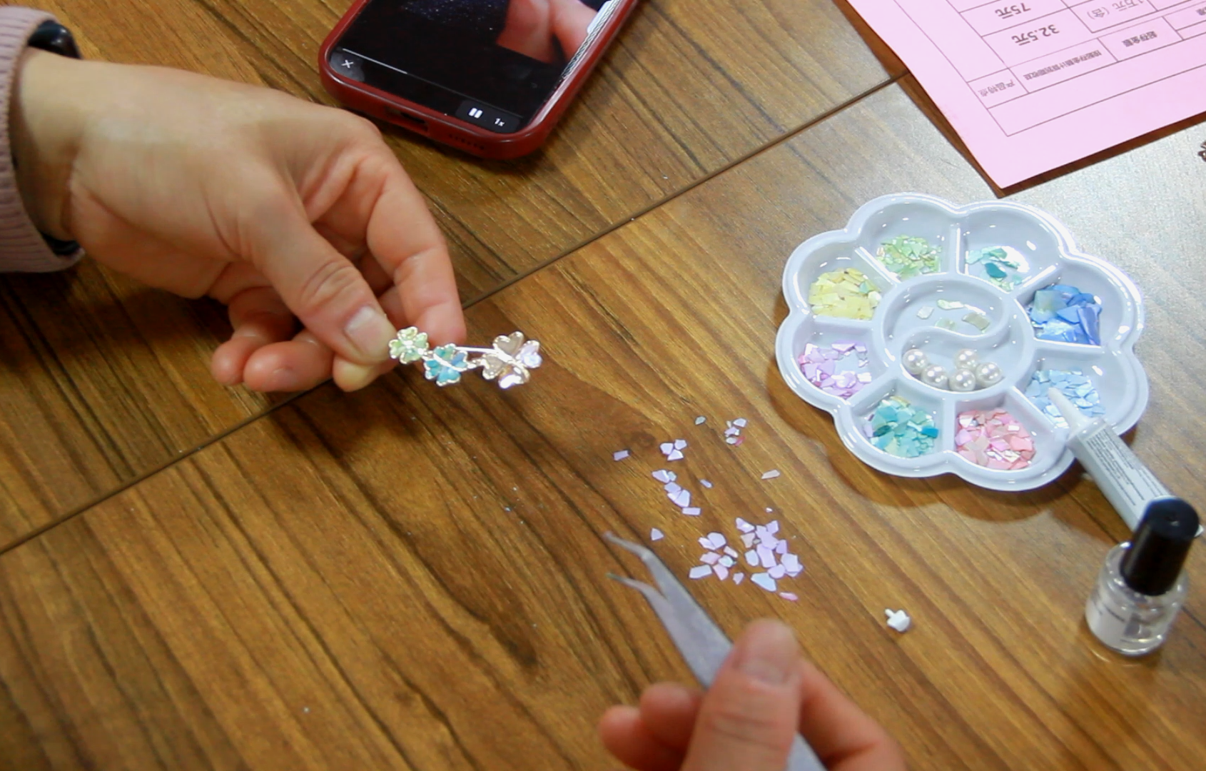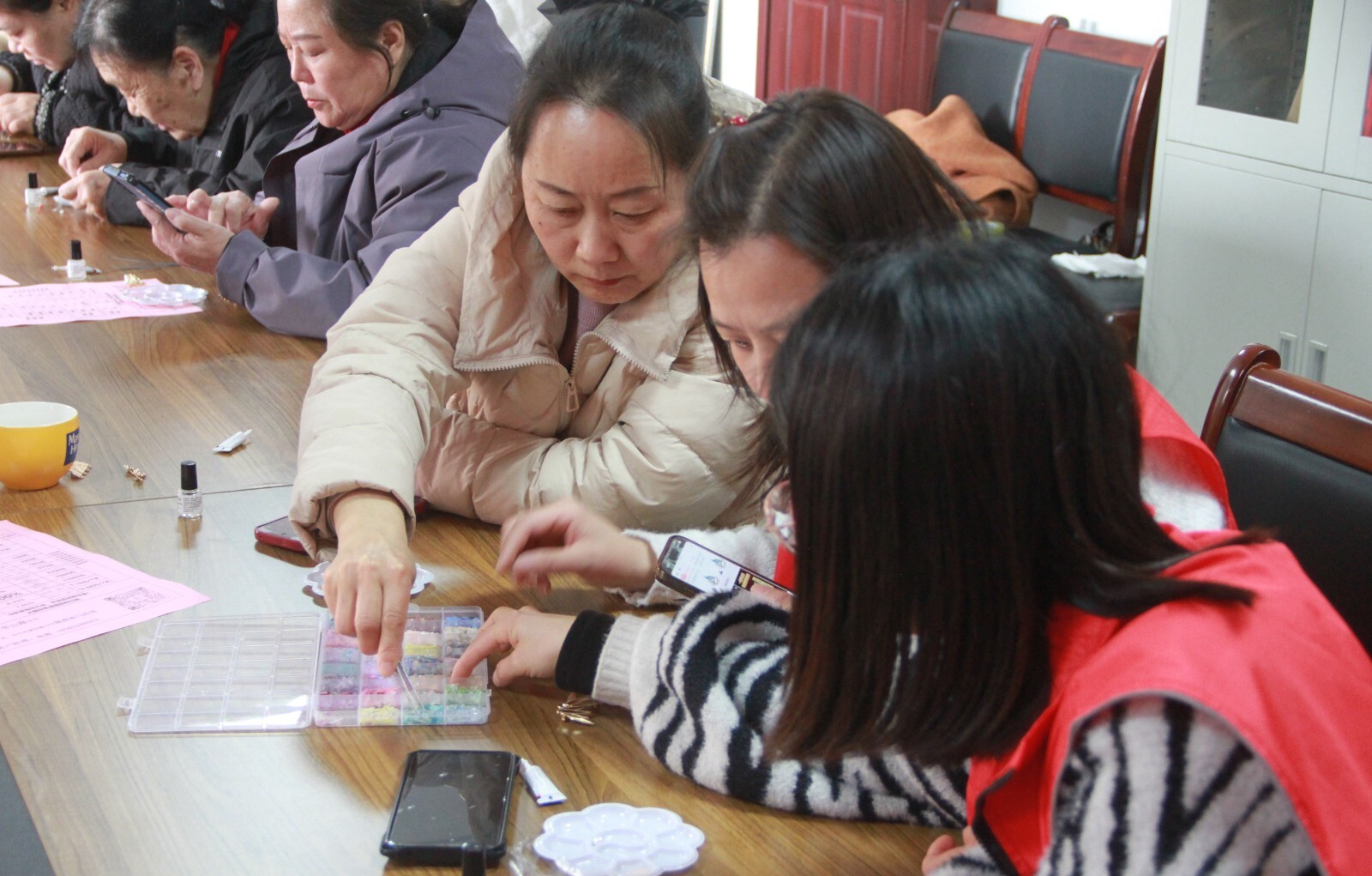 活动现场,志愿者详细讲解螺钿工艺的历史渊源、选材技巧与制作流程,并展示精美的螺钿作品,让居民直观感受这项古老工艺“薄如纸、亮如镜”的独特质感。实操环节中,大家手持螺片、镊子等工具,在指导下裁剪、镶嵌、固定,沉浸式体验螺钿制作的乐趣。从小心翼翼摆放螺片到耐心调整细节,居民们相互交流、互帮互助,现场氛围温馨融洽。经过一番忙碌,一枚枚流光溢彩的螺钿小摆件相继诞生,大家捧着亲手制作的作品,脸上满是成就感。