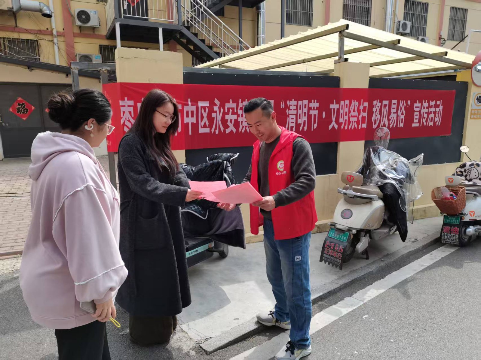 清明将至,为积极倡导清明节文明祭扫理念,持续推进移风易俗工作走深走实,4月1日,永安镇怡华园新时代文明实践站志愿者在辖区开展“清明节·文明祭扫 移风易俗”宣传活动。