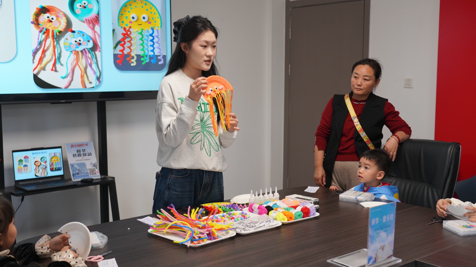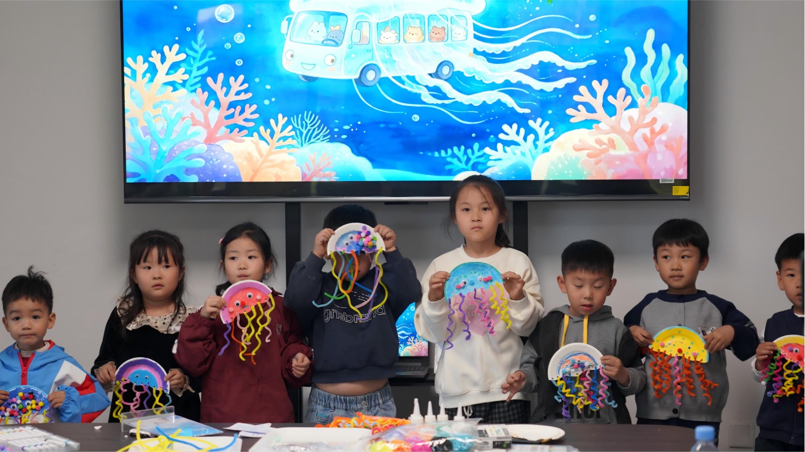活动现场,老师用生动的演绎与趣味互动,沉浸式讲述水母巴士的慢旅行故事,从被冷落的“慢巴士”,到在慢节奏中收获友谊、发现美景,让孩子们读懂 “每个人都有自己的成长节奏”,学会接纳自我、享受过程。故事分享后,亲子协作开展创意手工 DIY,共同制作灵动的 “游动的水母”,在动手实践中延续阅读的温暖与快乐。