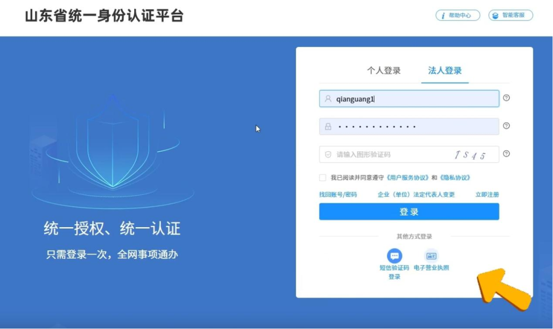 企业登录支持账号密码、短信验证码、电子营业执照三种方式。