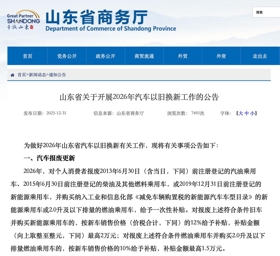 公告明确,2026年,对个人消费者报废2013年6月30日(含当日,下同)前注册登记的汽油乘用车、2015年6月30日前注册登记的柴油及其他燃料乘用车,或2019年12月31日前注册登记的新能源乘用车,并购买纳入工业和信息化部《减免车辆购置税的新能源汽车车型目录》的新能源乘用车或2.0升及以下排量的燃油乘用车,给予一次性补贴。对报废上述符合条件旧车并购买新能源乘用车的,按新车销售价格(价税合计,下同)的12%给予补贴,补贴金额(向上取整至整元,下同)最高2万元;对报废上述符合条件燃油乘用车并购买2.0升及以下排量燃油乘用车的,按新车销售价格的10%给予补贴,补贴金额最高1.5万元。