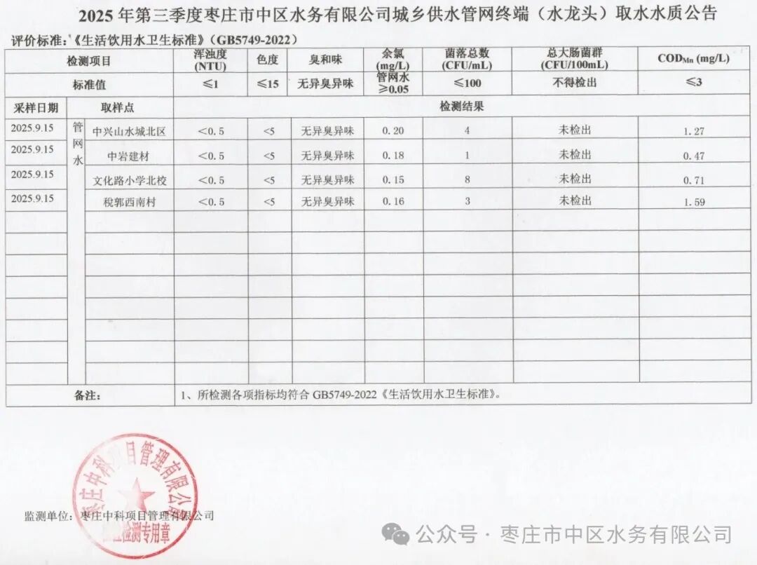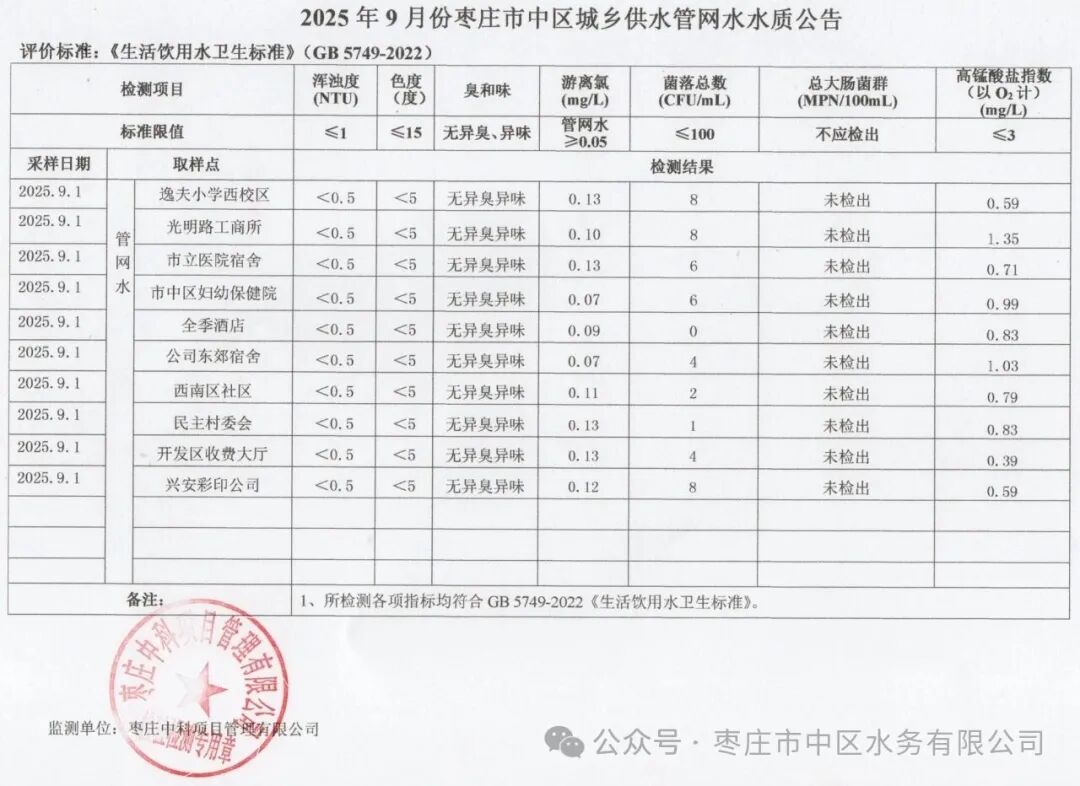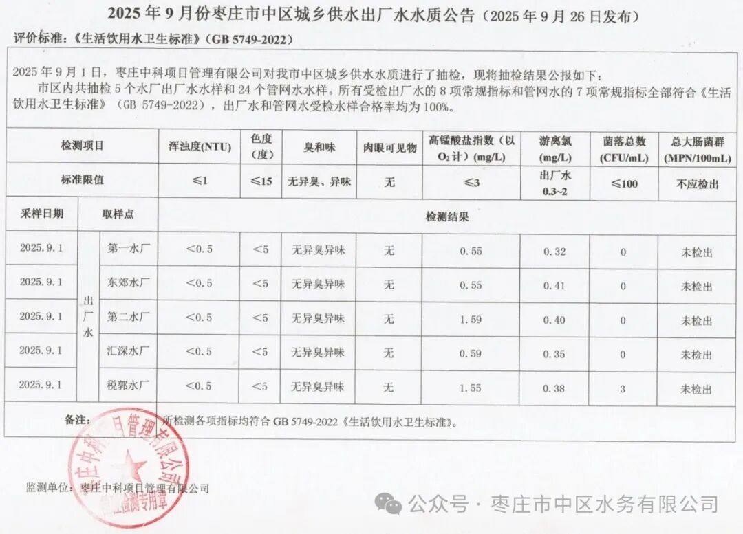 2025年9月份枣庄市中区城乡供水出厂水质公告
