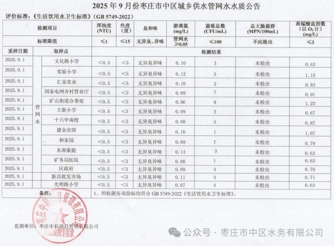 • 标  题:2025年9月份枣庄市中区城乡供水出厂水质公告