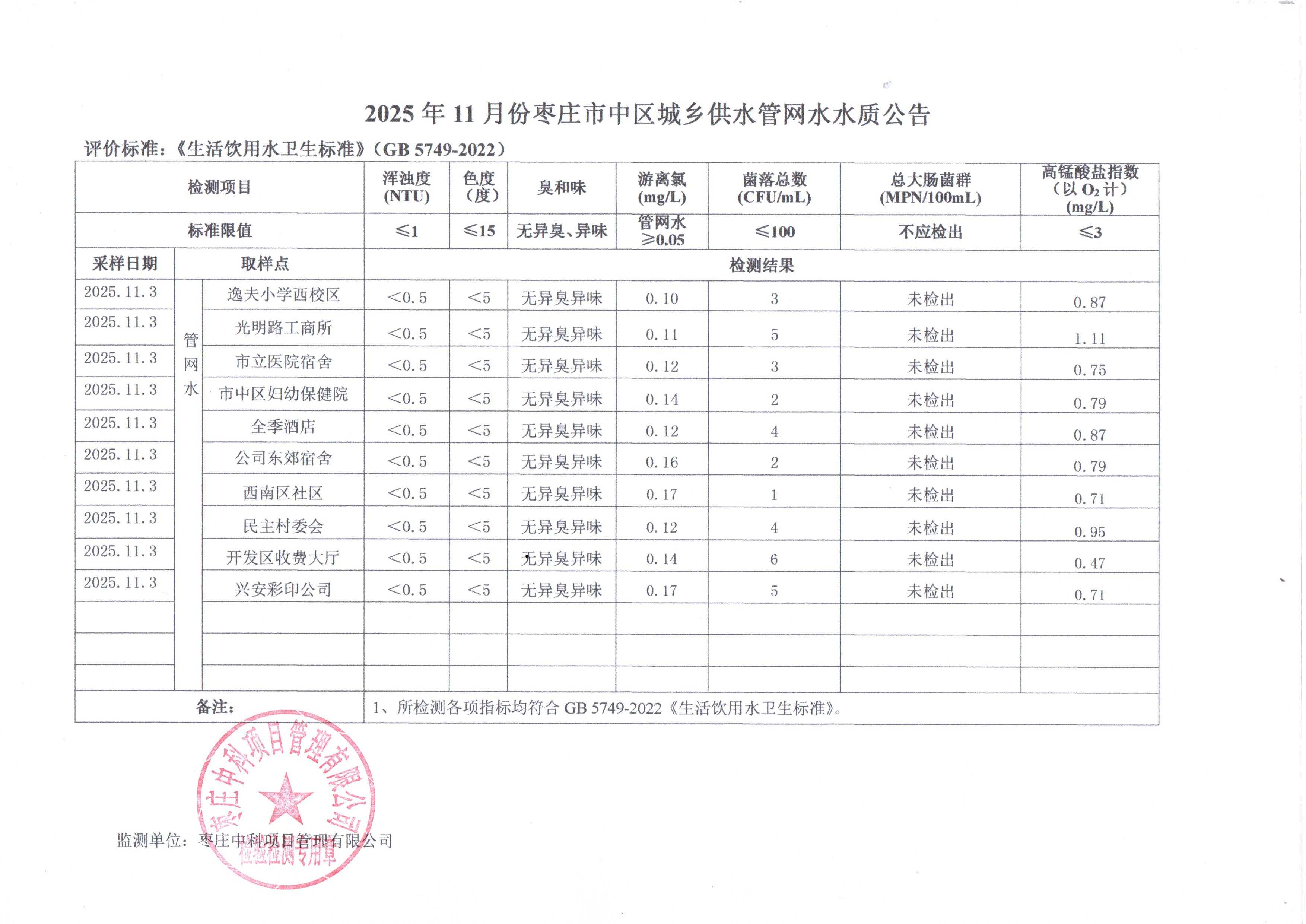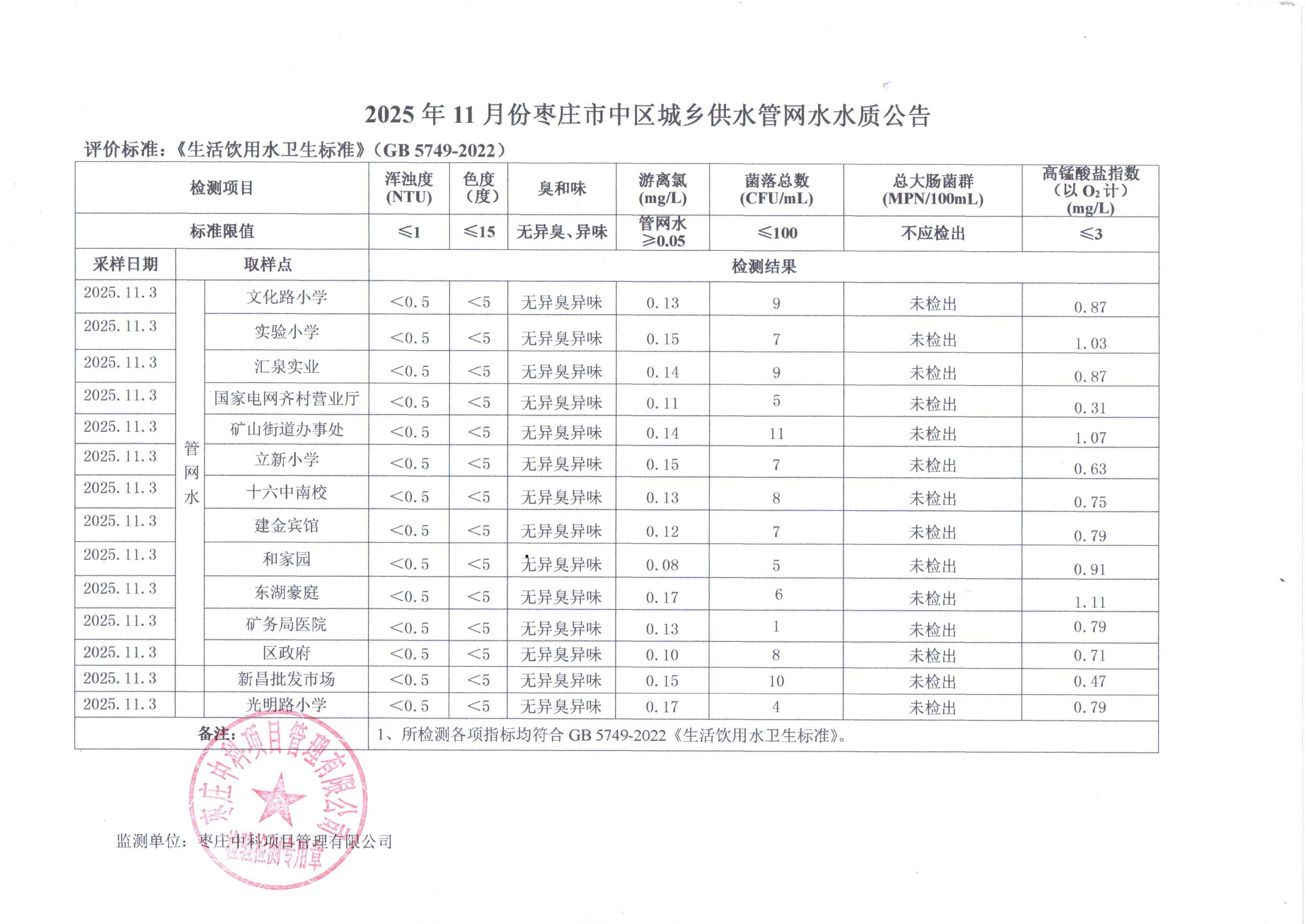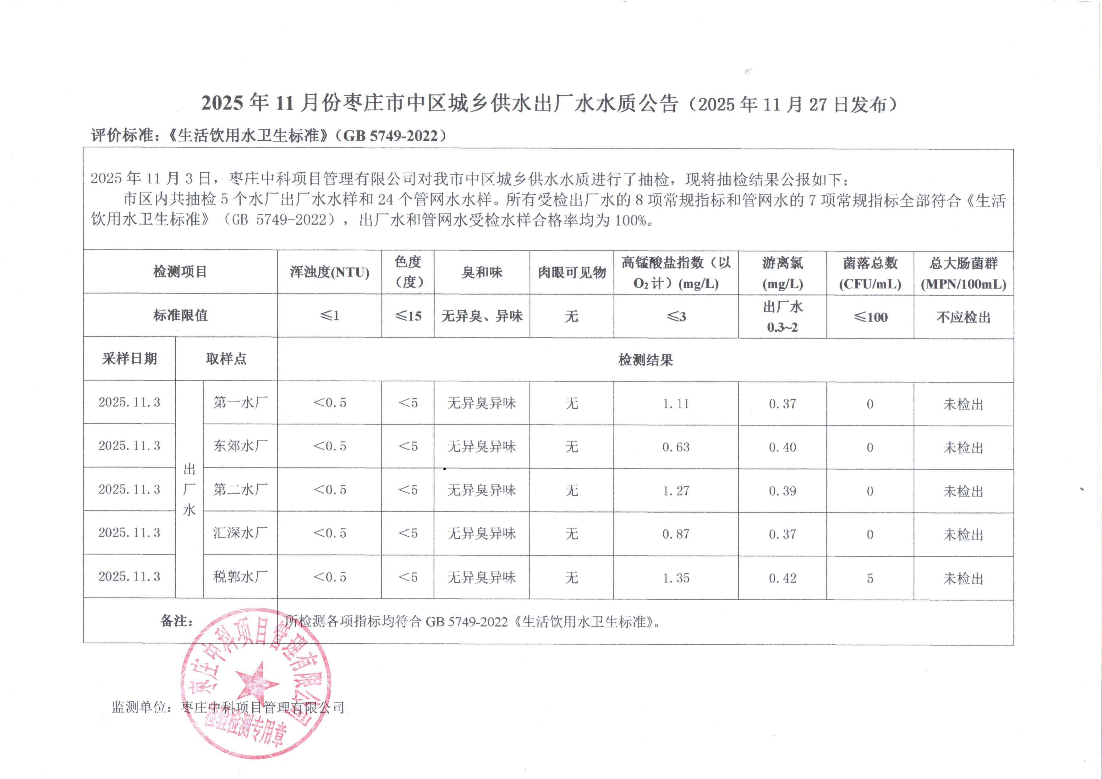 • 标  题:2025年11月份枣庄市中区城乡供水出厂水质公告
