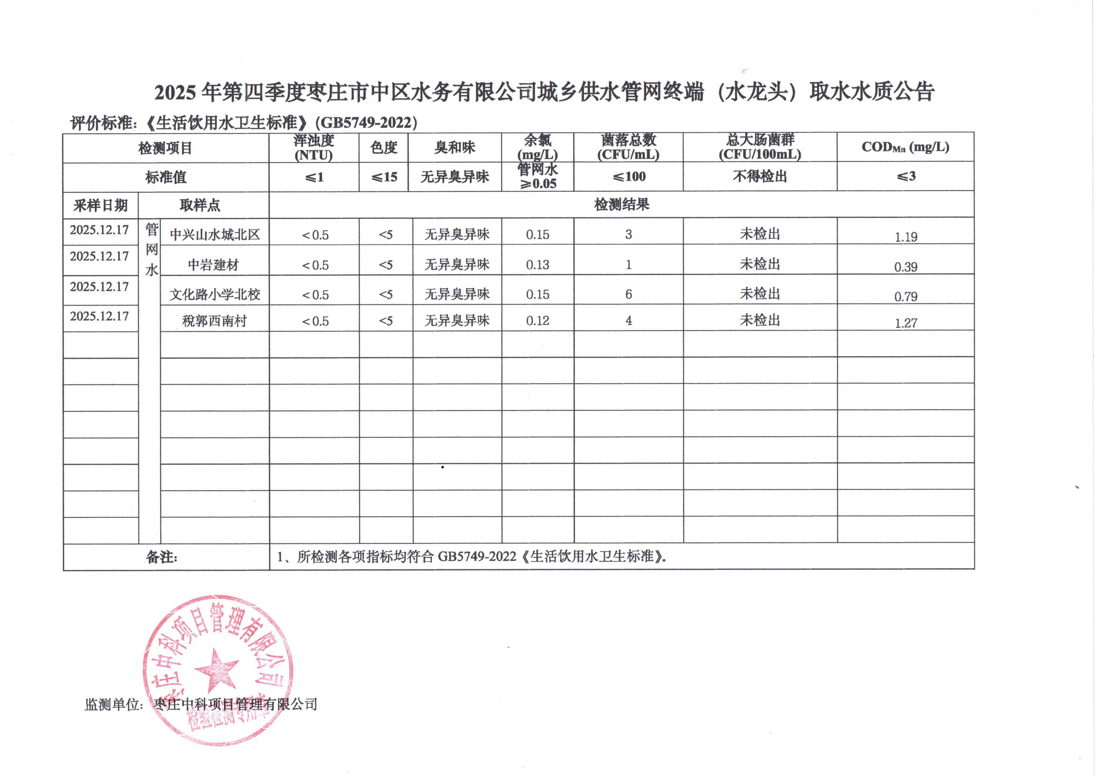 • 标  题:2025年第四季度枣庄市中区水务有限公司城乡供水管网终端(水龙头)取水水质公告