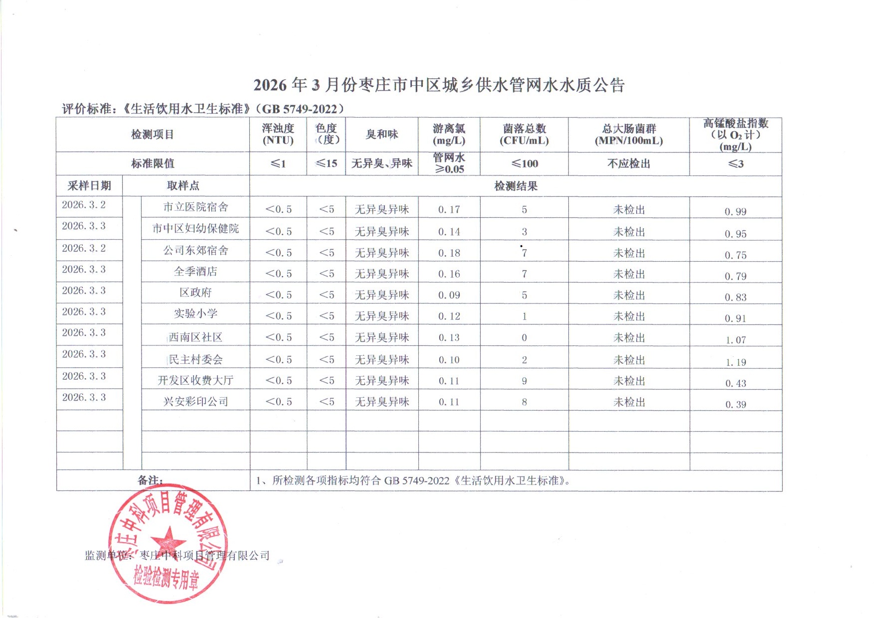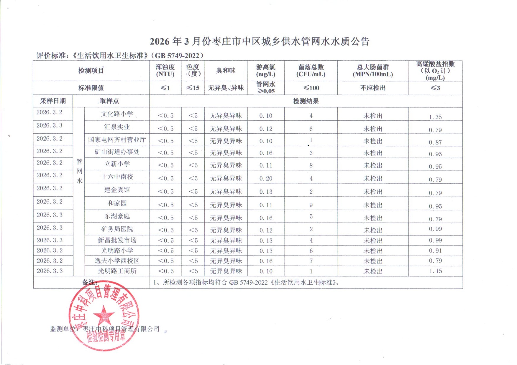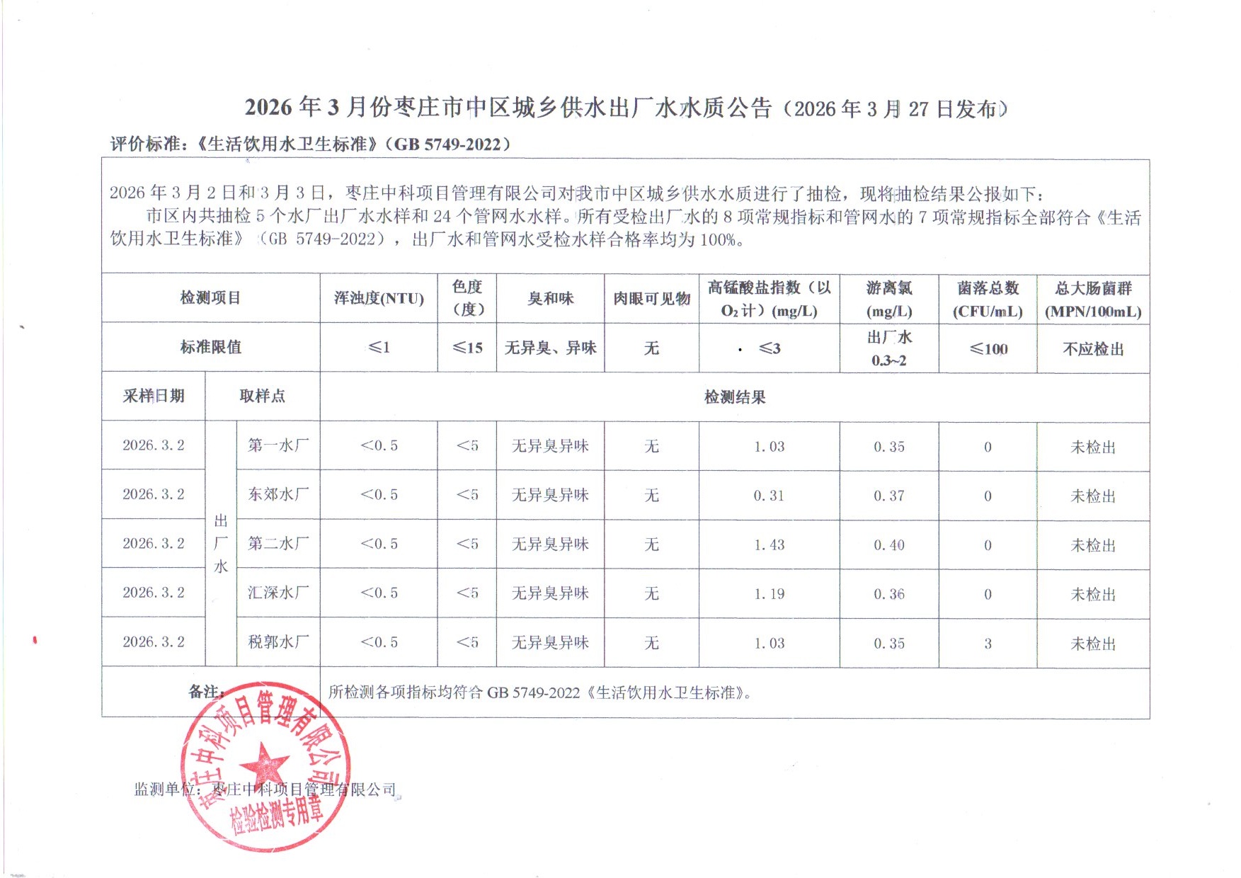 • 标  题:2026年3月份枣庄市中区城乡供水出厂水质公告