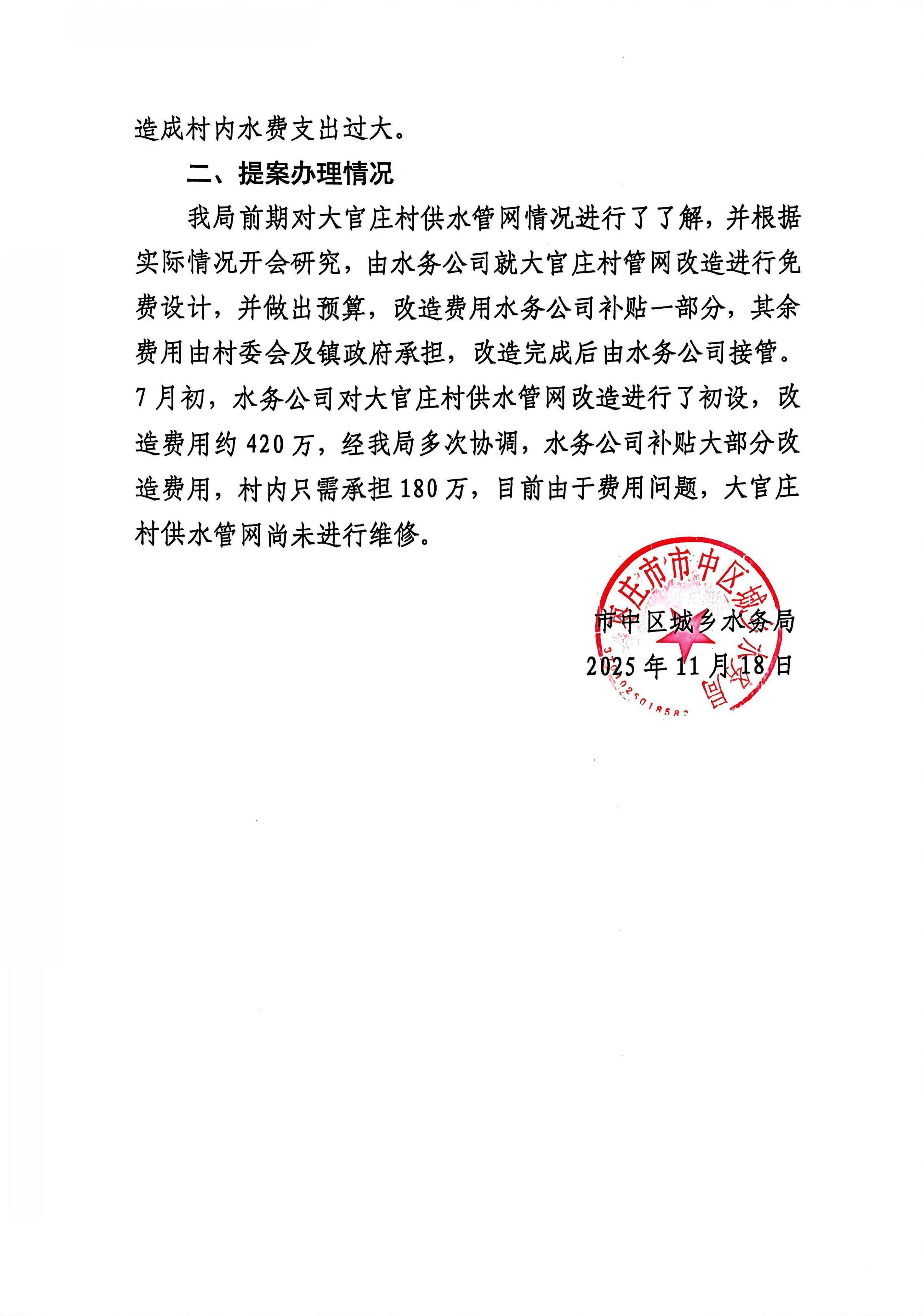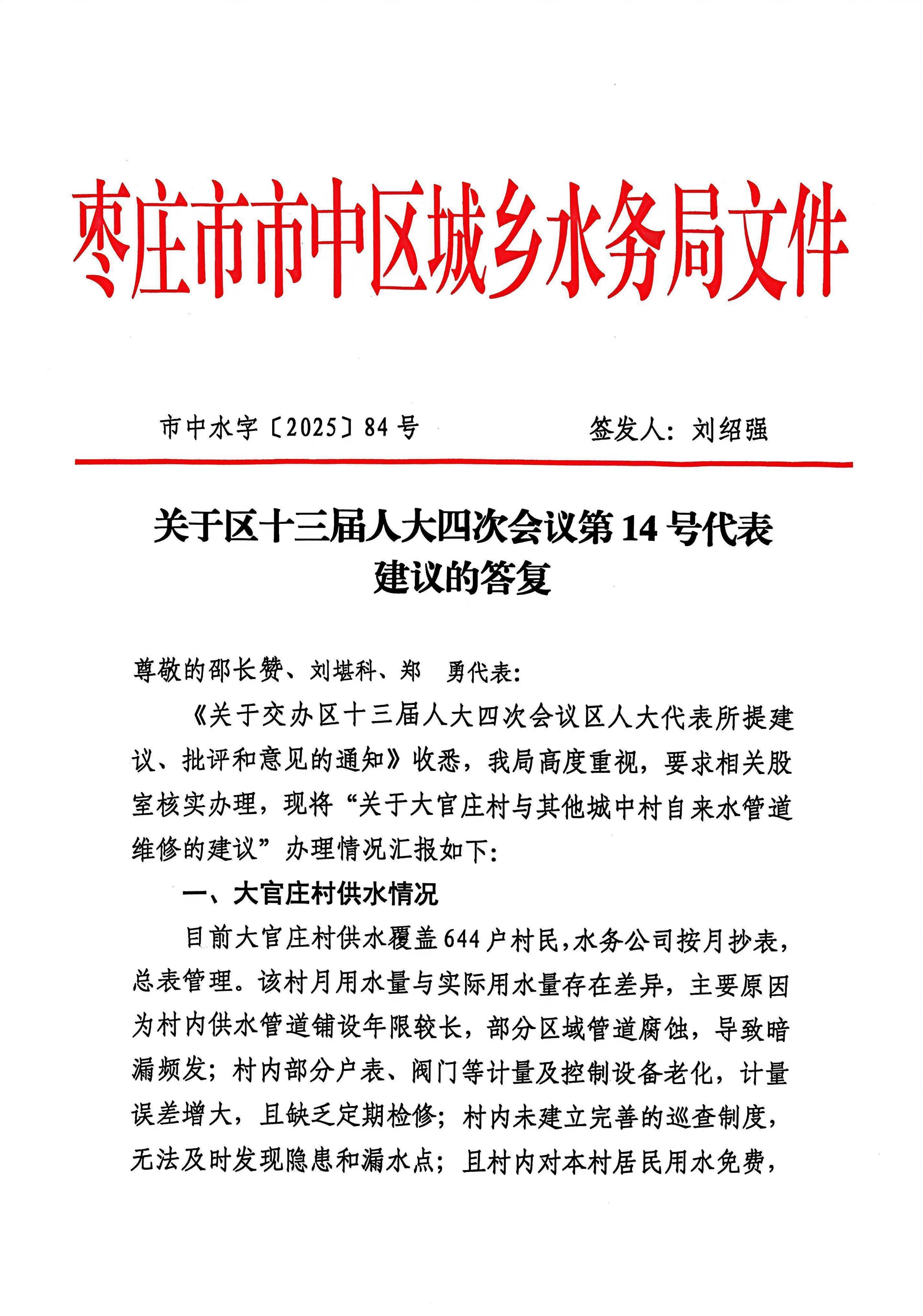 2025年度市中区城乡水务局关于区十三届人大四次会议第14号代表建议的答复(关于大官庄村与其他城中村自来水管道维修的建议)