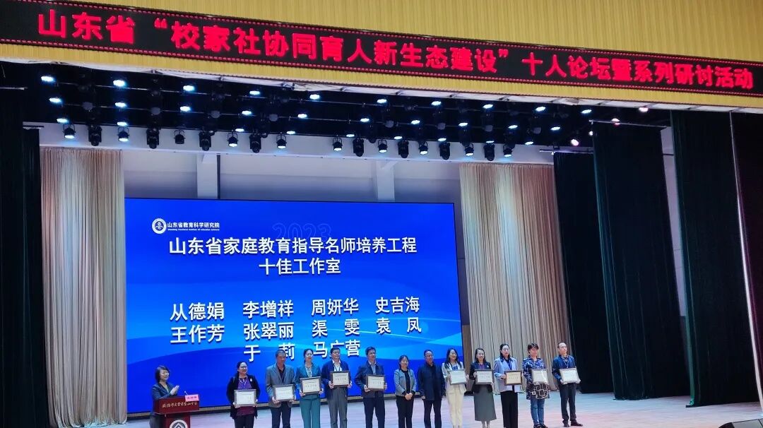 近日,山东省“校家社协同育人新生态建设”十人论坛暨系列研讨活动在威海举行。省教科院对“山东省家庭教育名师名校长培养”工作室进行了“十佳工作室”进行表彰,我区渠雯老师的名师工作室被授予山东省家庭教育指导名师培养工程“十佳工作室”荣誉称号。让我们一起来看看这个“十佳工作室”吧!