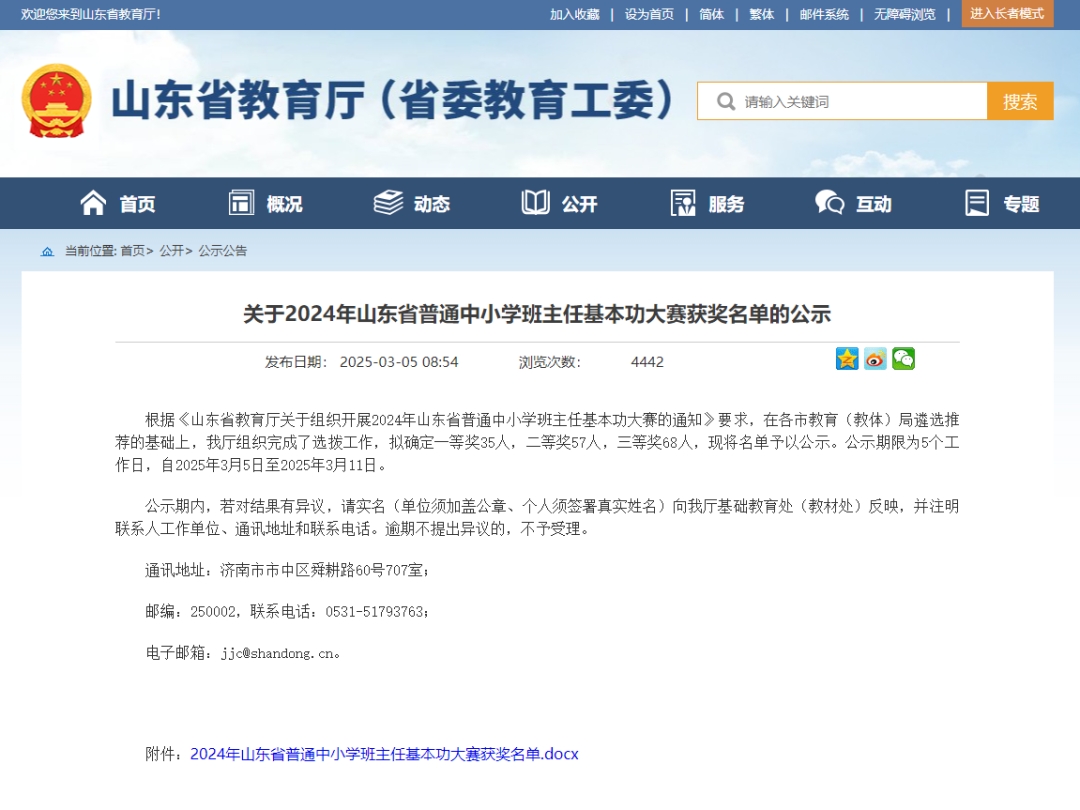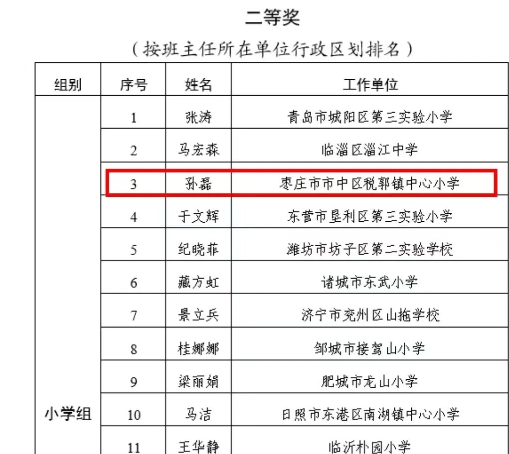 近日,山东省教育厅发布《关于2024年山东省普通中小学班主任基本功大赛获奖名单的公示》,经过县市级推荐和省级遴选,拟确定一等奖35人,二等奖57人,三等奖68人。市中区2位班主任榜上有名。