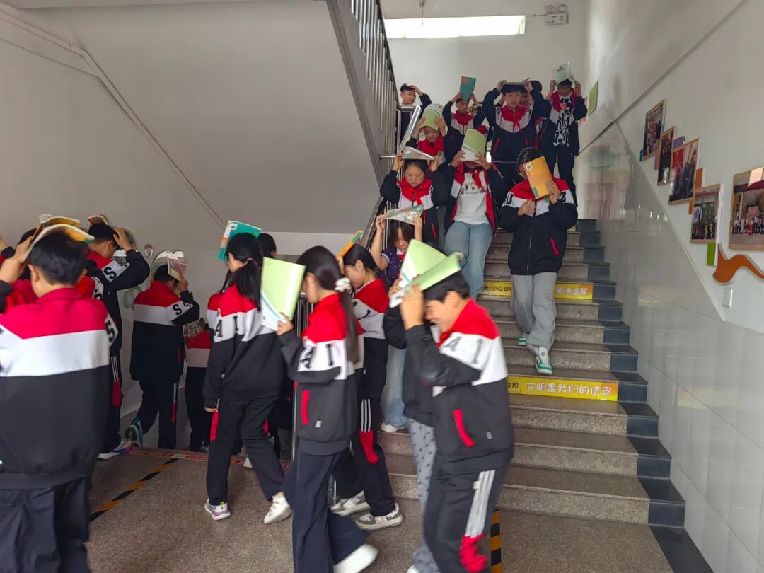 待第一波地震波过去,在老师的组织下,学生们用手或书本护住头部,沿着预定的疏散路线,安静、迅速、有序地向操场安全区域撤离。各楼层和关键位置均有教职工负责引导,确保疏散过程安全顺畅。