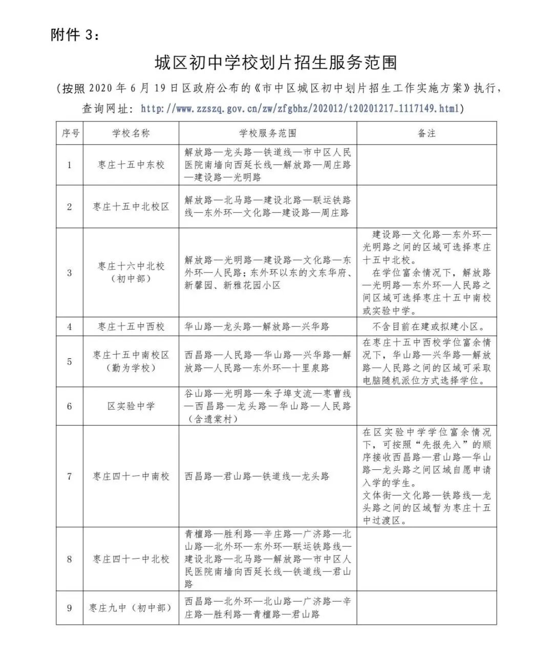 1.城区初中学校严格按照2020年6月19日区政府公布的《市中区城区初中划片招生工作实施方案》进行划片招生。各城区初中学校招生服务范围,详见附件3。