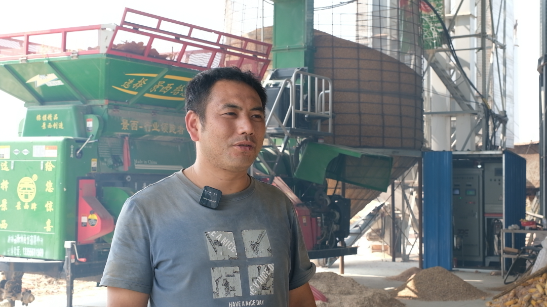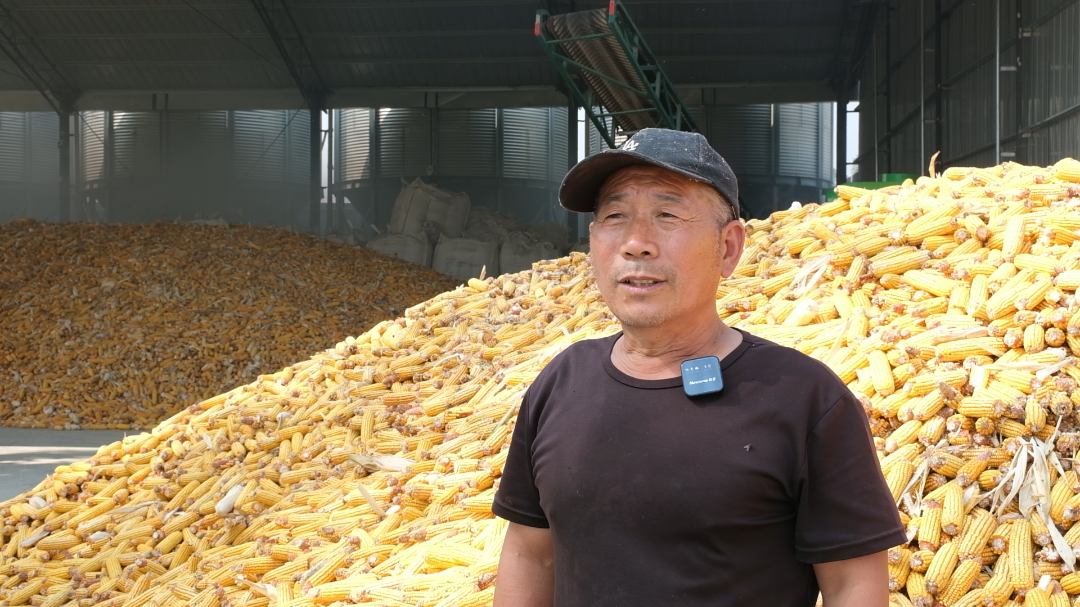 这是今年刚收上来的玉米,水分在34个左右,老百姓拉到我这个地方,我先进行脱粒处理,脱完粒玉米芯通过综合利用,能给老百姓实现免费的烘干,烘干后的玉米,既干净又能达到14个水分以内,符合国家收储的标准。