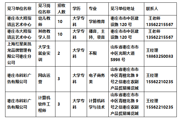 为深入推进青年见习工作,帮助高校毕业生和适龄青年提升就业能力,增强就业竞争力,根据《关于转发〈山东省人力资源和社会保障厅 山东省财政厅关于印发〈山东省就业见习工作实施细则〉的通知〉的通知》(枣人社字〔2024〕68号)要求,现将3月份征集的见习岗位需求公告如下:
