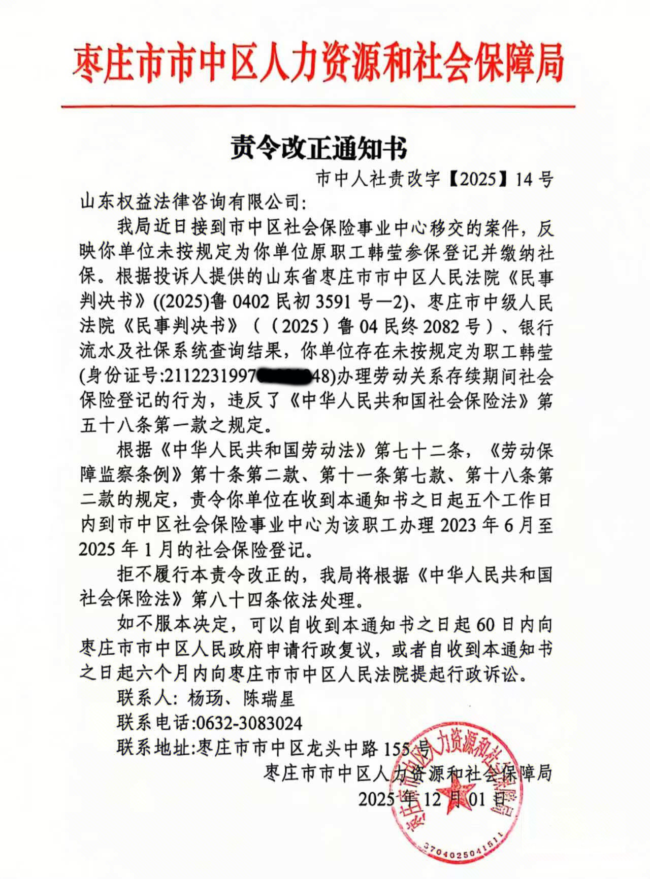 我局近日接到市中区社会保险事业中心移交的案件,反映你单位未按规定为你单位原职工韩莹参保登记并缴纳社保。根据投诉人提供的山东省枣庄市市中区人民法院《民事判决书》〔(2025)鲁0402民初3591号—2〕、枣庄市中级人民法院《民事判决书》〔(2025)鲁04民终2082号〕、银行流水及社保系统查询结果,你单位存在未按规定为职工韩莹(身份证号:2112231997xxxxxx48)办理劳动关系存续期间社会保险登记的行为,违反了《中华人民共和国社会保险法》第五十八条第一款之规定。