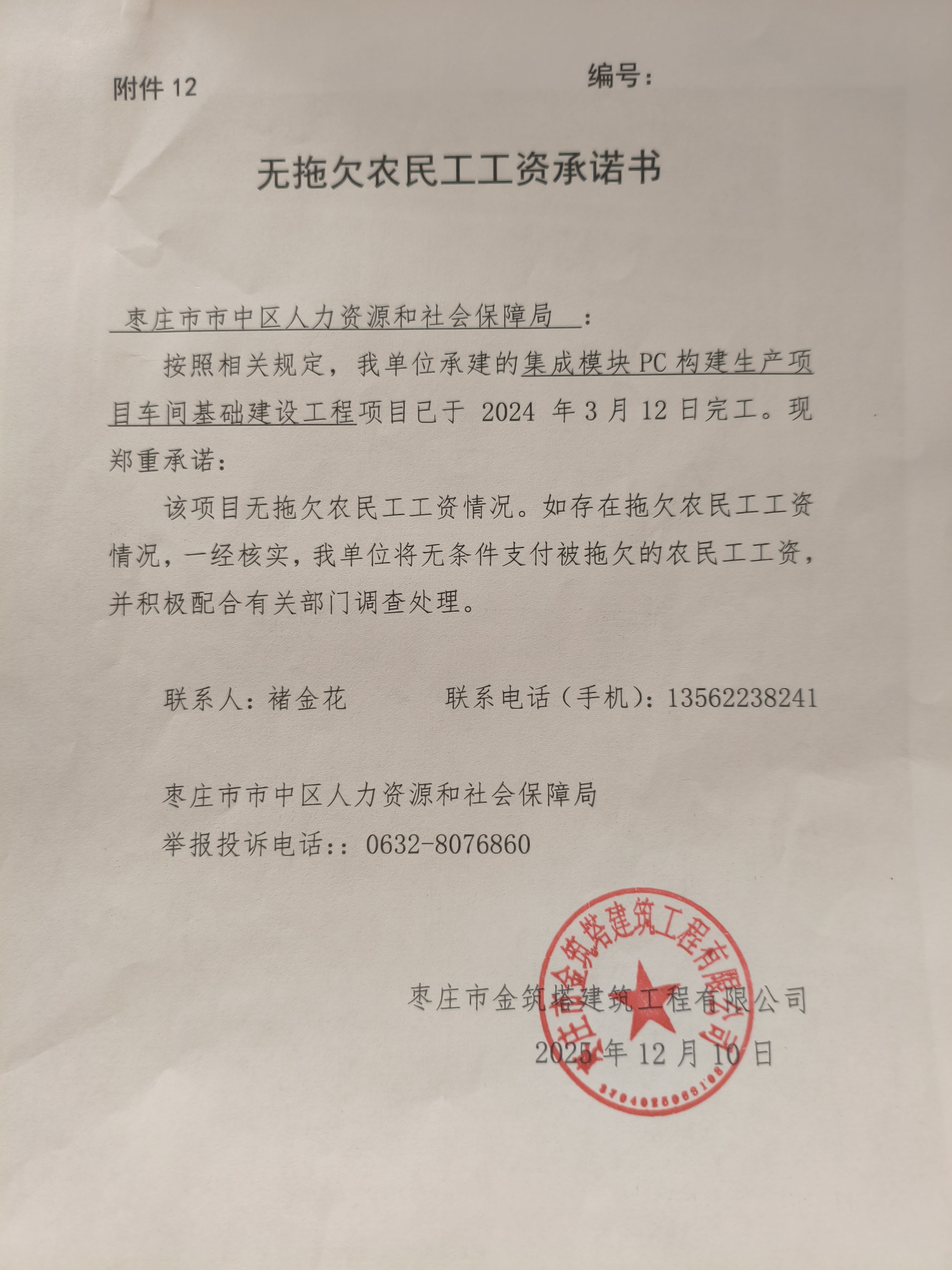 根据《枣庄市人力资源和社会保障局等7部门关于转发<山东省工程建设领域农民工工资保证金管理实施办法>的通知》(枣人社发[2022]11号)相关规定,现对枣庄市金筑塔建筑工程有限公司承建的集成模块PC构建生产项目车间基础建设工程项目申请返还农民工工资保证金情况进行公示。公示期间接受社会监督,如发现拖欠工资行为,我局将依法调查处理。公示期满未发现有拖欠工资行为的,我局将按规定程序返还农民工工资保证金。