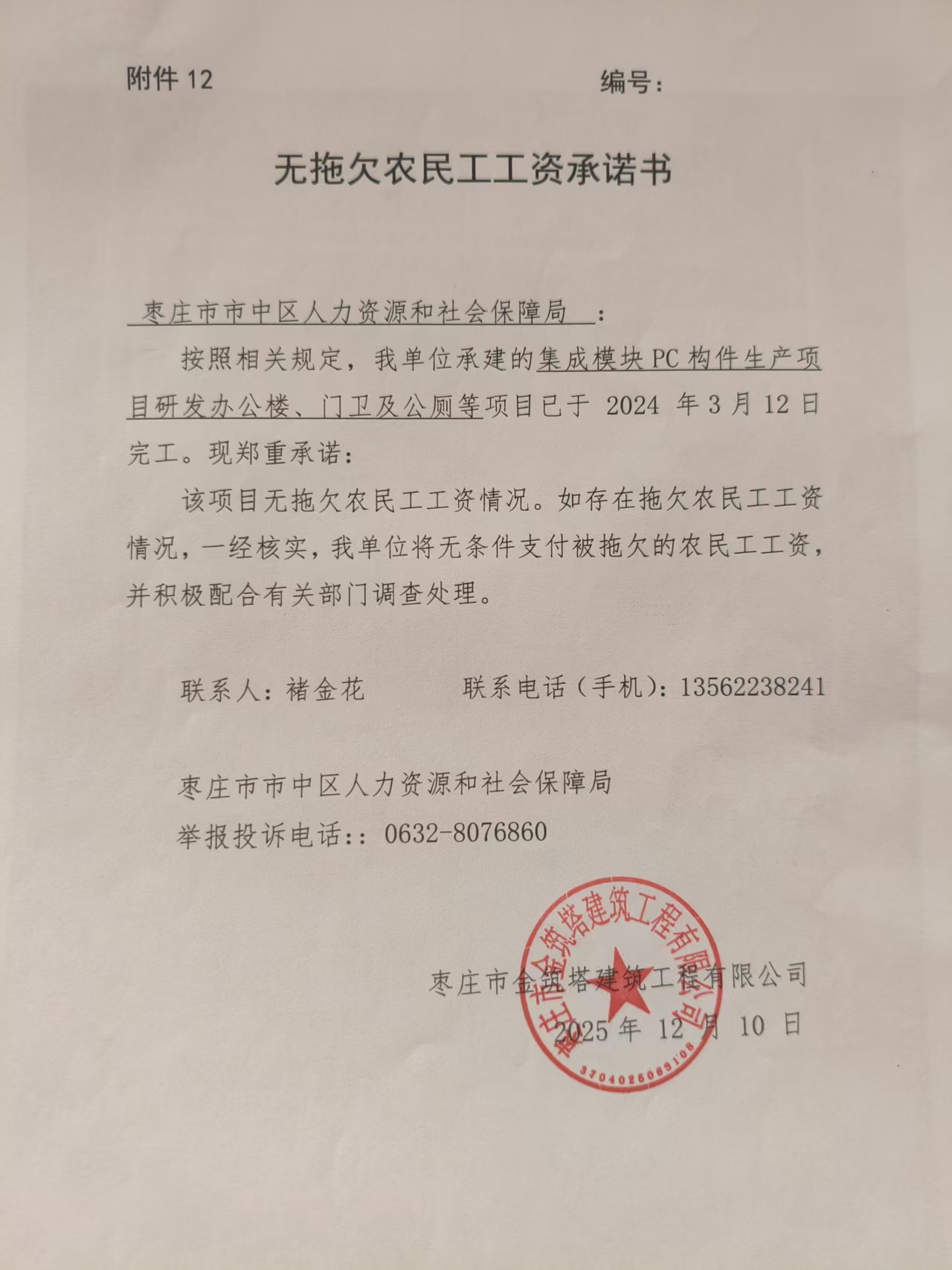 根据《枣庄市人力资源和社会保障局等7部门关于转发<山东省工程建设领域农民工工资保证金管理实施办法>的通知》(枣人社发[2022]11号)相关规定,现对枣庄市金筑塔建筑工程有限公司承建的集成模块PC构建生产项目研发办公楼、门卫及公厕项目申请返还农民工工资保证金情况进行公示。公示期间接受社会监督,如发现拖欠工资行为,我局将依法调查处理。公示期满未发现有拖欠工资行为的,我局将按规定程序返还农民工工资保证金。