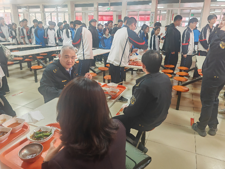 第九中学食堂检查结束后,市场监管局、教体局分管领导,执法人员,学校领导与学生共同排队取餐、同桌就餐,重点体验饭菜温度、营养搭配及卫生状况,详细记录陪餐意见。