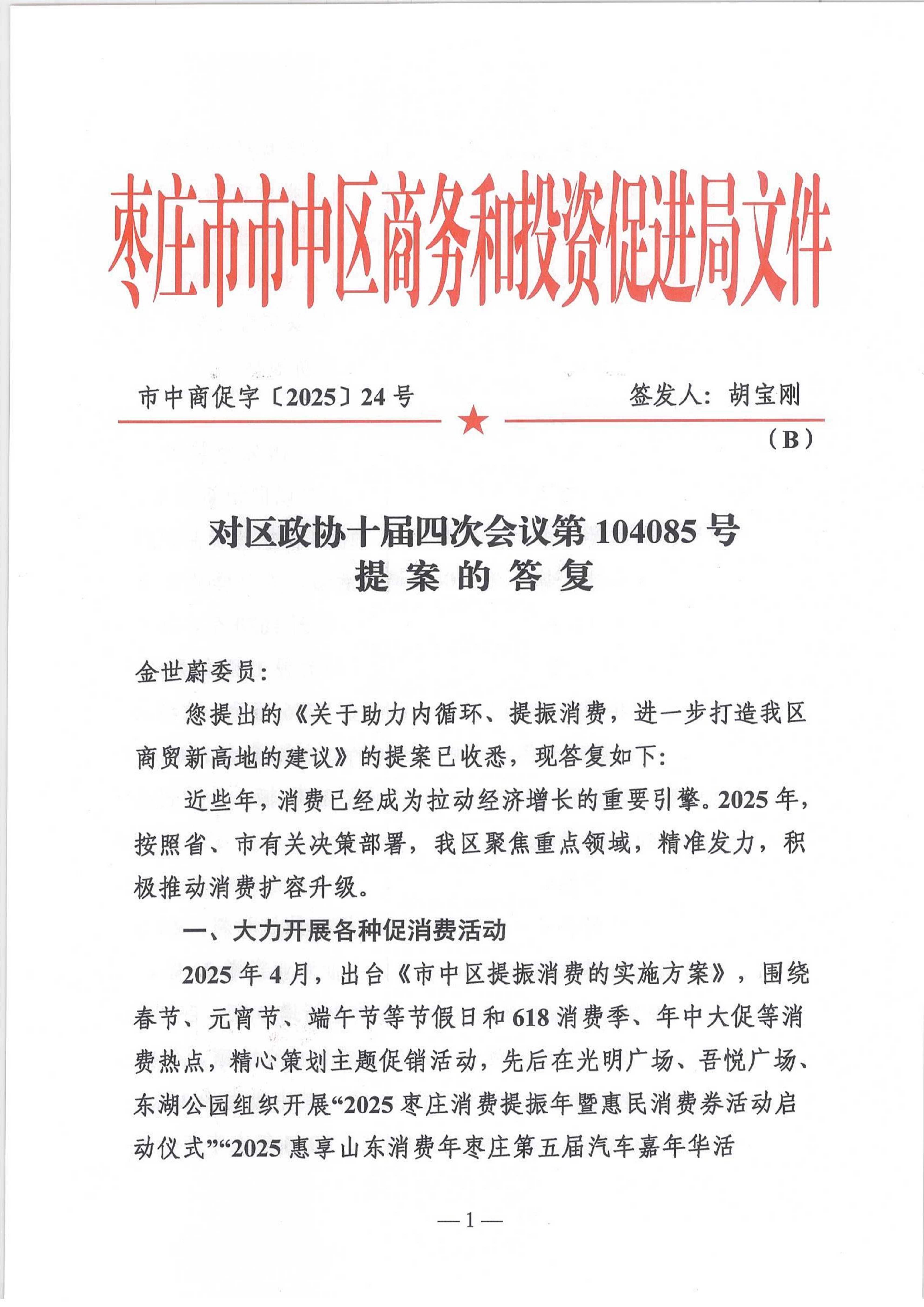 - 标 题:2025年度市中区商务和投资促进局关于区政协十届四次会议第104085号提案的答复(关于助力内循环、提振消费,进一步打造我区商贸新高地的建议)