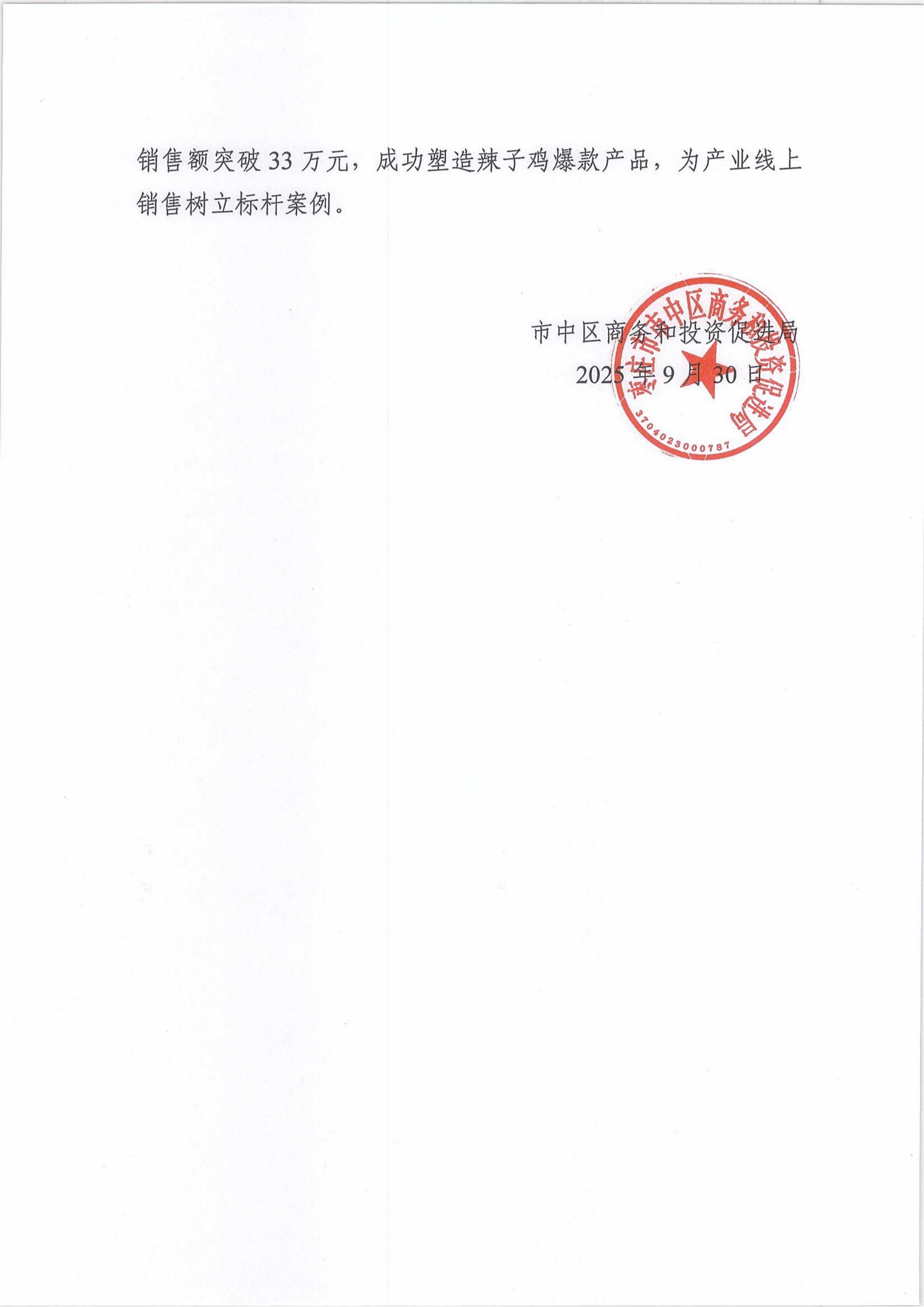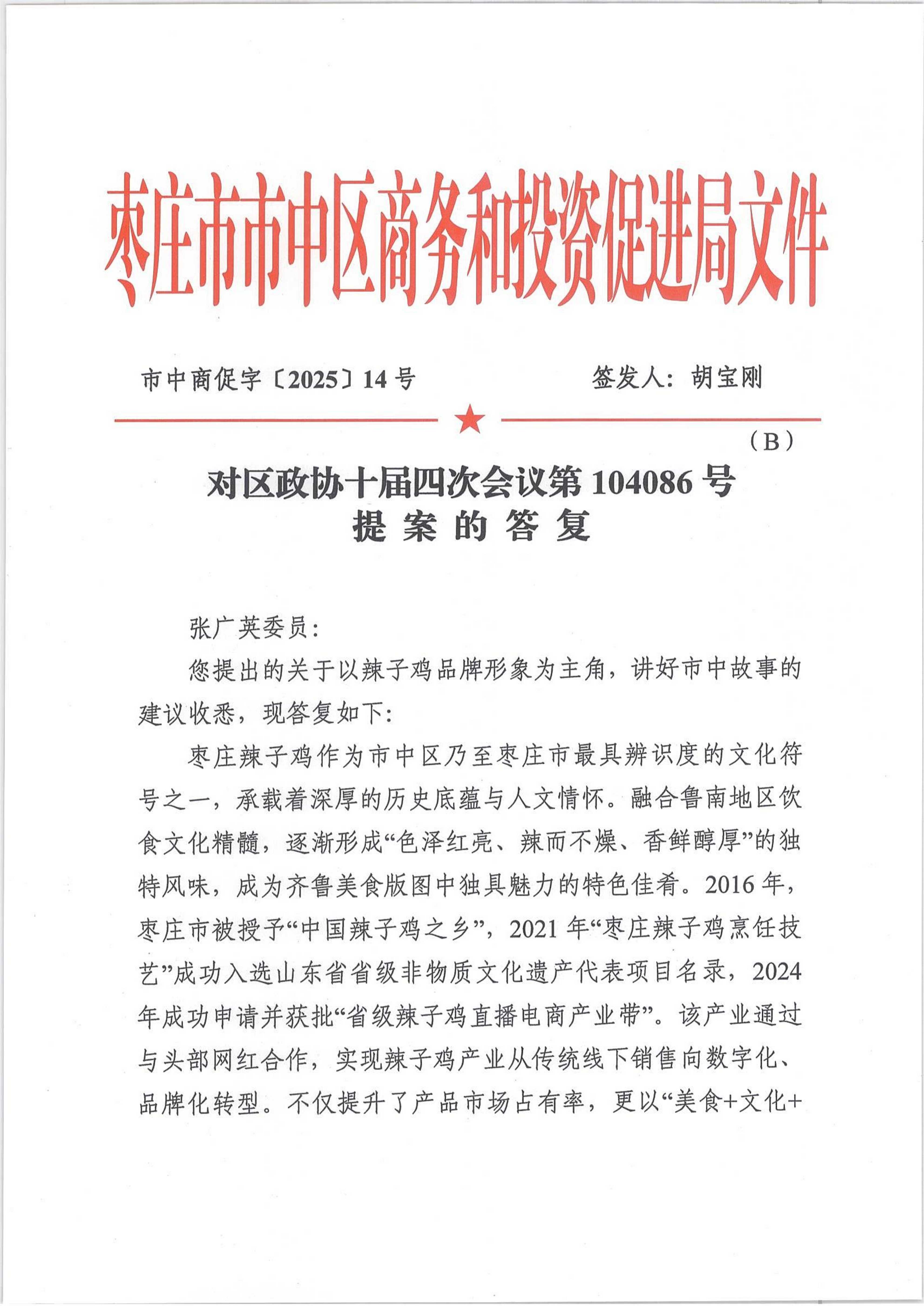 2025年度市中区商务和投资促进局关于区政协十届四次会议第104086号提案的答复(关于以辣子鸡品牌形象为主角,讲好市中故事的建议)