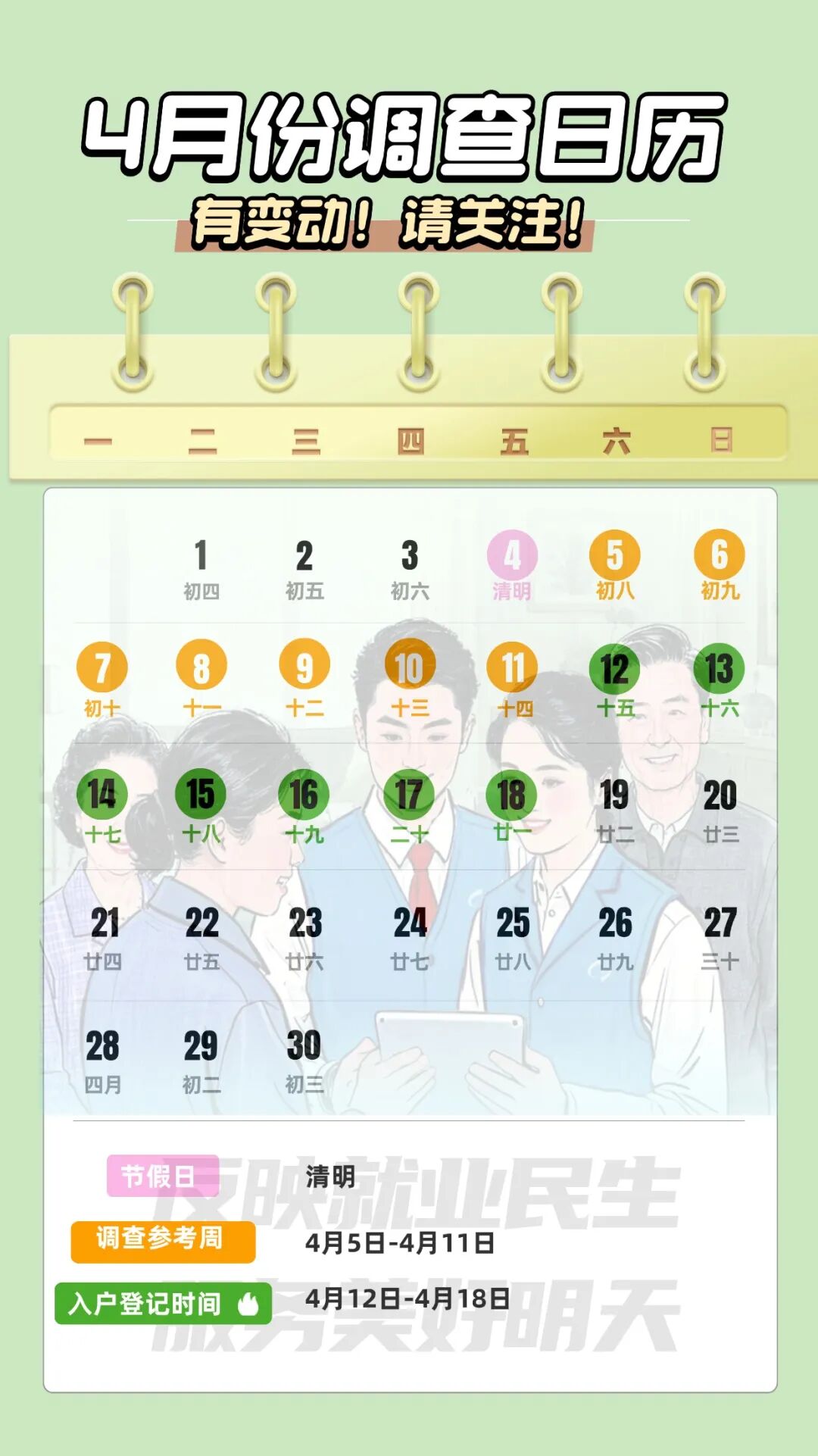 入户登记时间为每月10日-16日,因清明假期,本月入户登记时间进行了适当调整。调查日历如下: