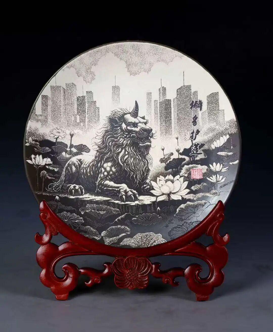 3. 宁静与喧嚣的平衡:獬豸与莲花营造出的宁静、祥和氛围,与背景中城市的喧嚣形成鲜明对比。这意在提醒人们在现代快节奏、充满诱惑的生活中,要保持内心的平静与纯净,不被外界的纷扰所左右,在喧嚣的世界中寻得一片属于自己的宁静之地,坚守内心的道德准则和精神追求。