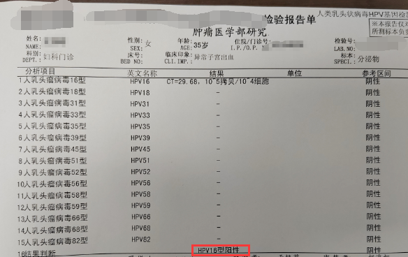 据世界卫生组织统计,有超过90%的宫颈癌患者病因是HPV感染,这其中又有约70%与16型和18型相关。如下面检验报告单所示: