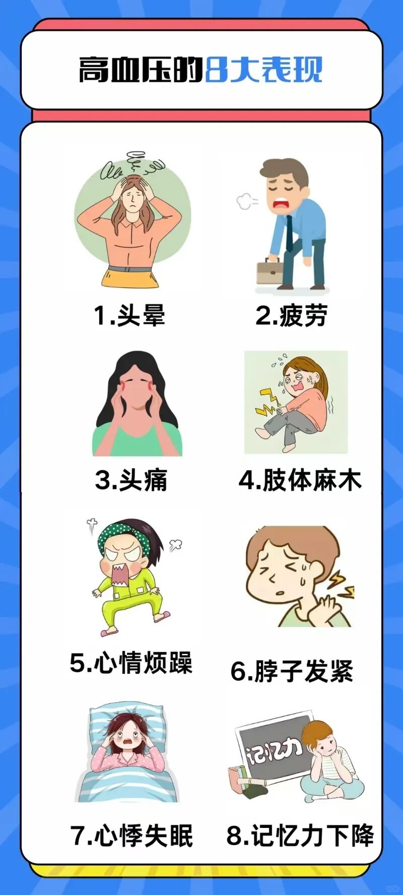 8)健康睡眠,养成每天7~8 h的睡眠习惯。