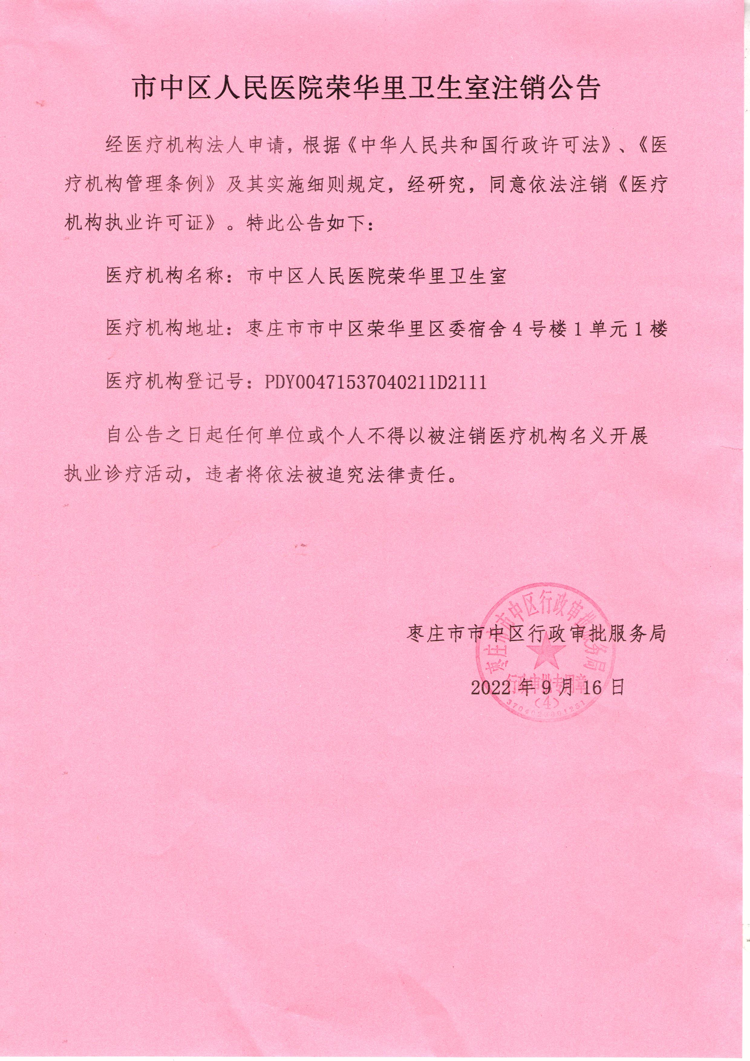 市中区行政审批服务局关于《市中区人民医院荣华里卫生室注销》的公告