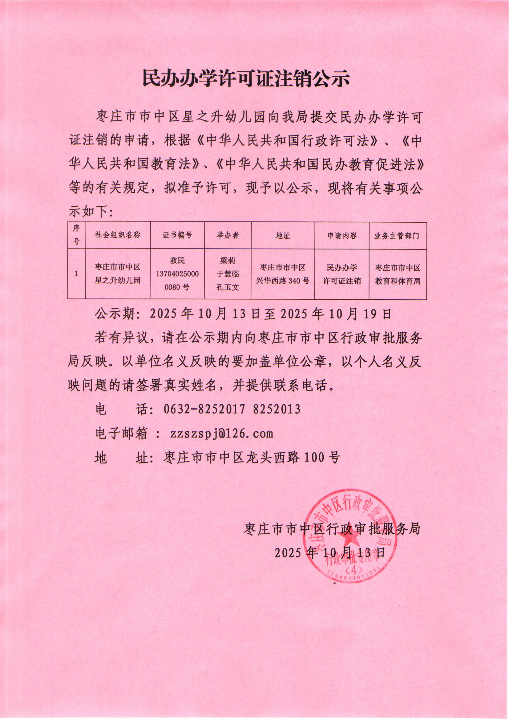 市中区行政审批服务局关于民办办学许可证注销的公示