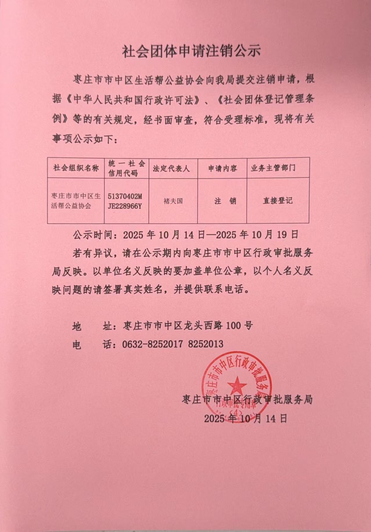 • 标  题:市中区行政审批服务局关于社会团体申请注销公示